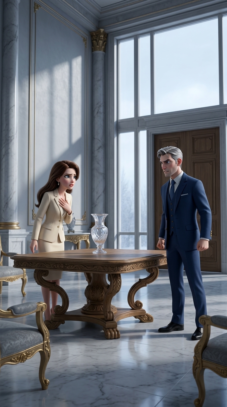 Art style: 3D Pixar. Просторный холл роскошного особняка с высокими потолками и блестящим мраморным полом. В центре стоит массивный дубовый стол с хрустальной вазой. Сквозь огромные окна в пол пробивается холодный утренний свет, создавая длинные резкие тени на стенах. Композиция представляет собой средний план, камера направлена на массивную входную дверь. Цветовая палитра состоит из холодных серых и белых тонов с редкими золотыми акцентами. На лицах персонажей отражается гнев и полное отчаяние. ━━━━━━━━━━━━━━━━━━━━━━━━━━━━━━━━━━━━━━ FINAL STYLE ENFORCEMENT (this is the authoritative rendering directive — it overrides any style wording elsewhere in the prompt): Render this image entirely in "3D Pixar" style. Match the lighting grammar, material response, colour science, level of realism / stylisation, line weight, and shading model typical of "3D Pixar". Keep the subject, composition, camera angle, lighting direction, and colour palette from the description above — but EVERY surface, skin, fabric, material, and environmental element must be rendered in the "3D Pixar" idiom, not in any other medium. Character appearance reference (MUST match exactly): - Артур: Статный мужчина 45 лет с атлетическим телосложением и короткой стрижкой с проседью на висках. У него пронзительные холодные голубые глаза, тонкие губы и резко очерченные скулы. Одет в дорогой темно-синий костюм-тройку из элитной шерсти с белоснежной рубашкой и золотыми запонками. Взгляд властный, выражающий полное превосходство. Фон — роскошный кабинет с кожаной мебелью и панорамным видом на мегаполис. Освещение жесткое, подчеркивающее каждую морщину и суровость лица. Стиль классического фотореализма с глубокими тенями. - Елена: Элегантная женщина 30 лет с утонченными чертами лица и длинными каштановыми волосами. У неё большие выразительные карие глаза, в которых читается внутренняя сила. В начале истории она выглядит хрупкой, в финале — уверенной бизнес-леди в кремовом деловом костюме. Светлая кожа, естественный макияж, грациозная осанка. Фон меняется от мрачного дождевого города до светлого уютного интерьера её собственного кафе. Освещение мягкое и теплое, создающее ореол вокруг волос. Стиль детальной цифровой живописи с мягким фокусом. Reference images context (match the visual style and elements from these): - Принц в роскошном наряде (character): Молодой человек с каштановыми волосами в богато украшенном темно-синем костюме с золотой вышивкой и длинным плащом. Он стоит в величественном тронном зале с высокими окнами и мраморным полом, создавая атмосферу благородства и сказки. - Принцесса в роскошном платье (character): Молодая женщина в богато украшенном фиолетовом и кремовом платье с золотой вышивкой стоит в величественном дворцовом зале с мраморными колоннами и лестницей. Атмосфера торжественная и сказочная, выполненная в стиле современной 3D-анимации с детальной проработкой текстур и освещения.
