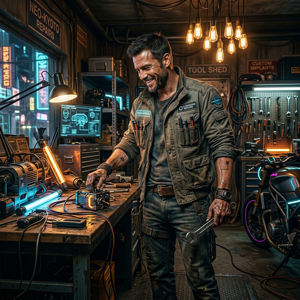 Strong rule: style --- Cyberpunk ---. Strong rule: style --- Cyberpunk ---. Мужчина 40 лет, полноват, с щитиной, решительным взглядом и уверенной улыбкой. Короткие темные волосы, загорелая кожа от работы на улице. Носит потрепанную рабочую куртку с карманами для инструментов, джинсы с ремнем, тяжелые ботинки. Руки в мозолях, с масляными пятнами. Энергичный, сосредоточенный вид. Фон: гараж с верстаком и инструментами. Теплое освещение от ламп, реалистичный стиль с детализированными текстурами металла и дерева.