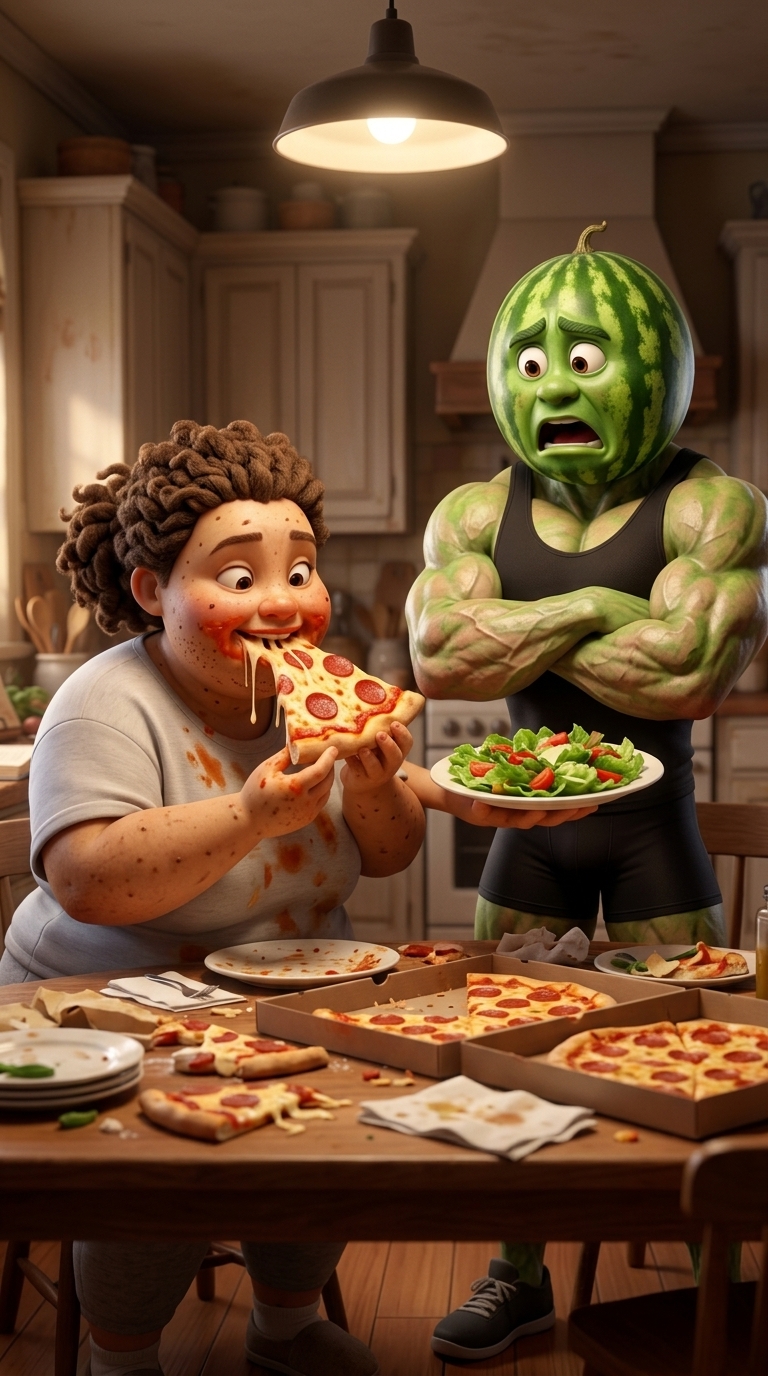 Art style: 3D анимация в стиле Pixar. Интерьер кухни. Женщина-картошка жадно вгрызается в кусок пиццы, красный соус и расплавленный сыр пачкают ее лицо и футболку. Мужчина-арбуз стоит рядом, скрестив мощные руки на груди, с выражением глубокого отвращения и шока. В его руке тарелка с нетронутым салатом. Освещение подчеркивает беспорядок на столе. ━━━━━━━━━━━━━━━━━━━━━━━━━━━━━━━━━━━━━━ FINAL STYLE ENFORCEMENT (this is the authoritative rendering directive — it overrides any style wording elsewhere in the prompt): Render this image entirely in "3D анимация в стиле Pixar" style. Match the lighting grammar, material response, colour science, level of realism / stylisation, line weight, and shading model typical of "3D анимация в стиле Pixar". Keep the subject, composition, camera angle, lighting direction, and colour palette from the description above — but EVERY surface, skin, fabric, material, and environmental element must be rendered in the "3D анимация в стиле Pixar" idiom, not in any other medium. Character appearance reference (MUST match exactly): - Арбузный Человек: Strong rule: style --- 3D анимация в стиле Pixar ---. Антропоморфный мужчина с головой в виде целого спелого арбуза с характерными зелеными полосами. У него чрезвычайно мускулистое телосложение, напоминающее профессионального бодибилдера, с ярко выраженными венами и рельефными мышцами. Он одет в черную облегающую майку и короткие черные спортивные шорты. Кожа на теле имеет легкий зеленоватый оттенок. Персонаж выполнен в стиле детальной 3D анимации с реалистичными текстурами тканей и кожи. - Картофельная Женщина: Strong rule: style --- 3D анимация в стиле Pixar ---. Женщина с пышными формами, чья кожа и голова имеют текстуру и вид неочищенного картофеля с небольшими глазками-бугорками. У нее округлое лицо, пухлые щеки и маленькие карие глаза. Она носит мешковатую светло-серую футболку, которая не скрывает ее полный живот, и соответствующие спортивные штаны. Ее облик выражает страсть к еде и небрежность. Стиль качественной 3D анимации с мягким освещением.