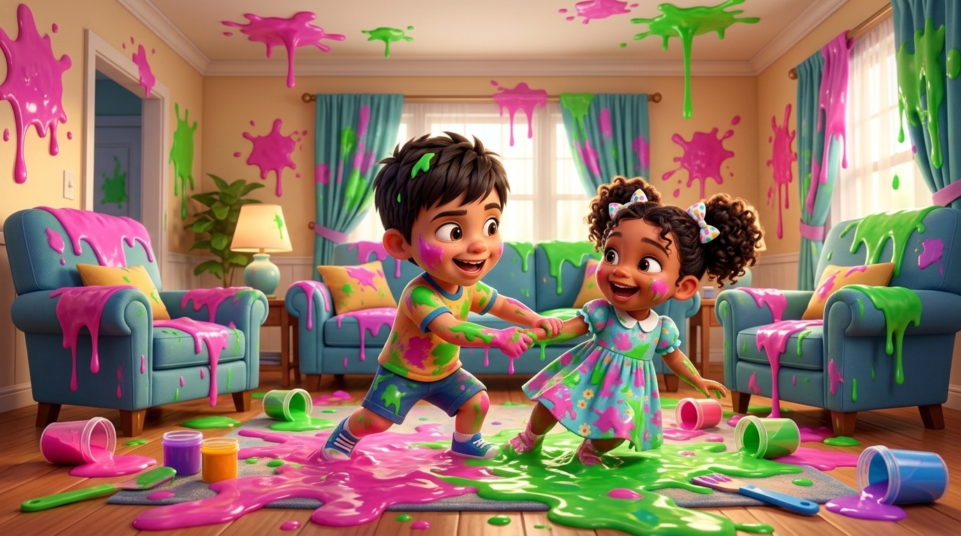 Art style: Яркая и красочная 3D-анимация в стиле Pixar, с .... Широкий кадр гостиной, которая превратилась в поле битвы слаймов. Розовые и зеленые кляксы повсюду: на стенах, на диване, на шторах и даже на потолке. Дети, полностью перепачканные, счастливо катаются по полу. ━━━━━━━━━━━━━━━━━━━━━━━━━━━━━━━━━━━━━━ FINAL STYLE ENFORCEMENT (this is the authoritative rendering directive — it overrides any style wording elsewhere in the prompt): Render this image entirely in "Яркая и красочная 3D-анимация в стиле Pixar, с ..." style. Match the lighting grammar, material response, colour science, level of realism / stylisation, line weight, and shading model typical of "Яркая и красочная 3D-анимация в стиле Pixar, с ...". Keep the subject, composition, camera angle, lighting direction, and colour palette from the description above — but EVERY surface, skin, fabric, material, and environmental element must be rendered in the "Яркая и красочная 3D-анимация в стиле Pixar, с ..." idiom, not in any other medium. Character appearance reference (MUST match exactly): - Арти: Strong rule: style --- Яркая и красочная 3D-анимация в стиле Pixar, с ... ---. Мальчик 4 лет, короткие темные волосы, большие любопытные карие глаза с длинными черными ресницами. Одет в яркую футболку и шорты. Энергичное и шаловливое выражение лица. - Тери: Strong rule: style --- Яркая и красочная 3D-анимация в стиле Pixar, с ... ---. Девочка 4 лет, кудрявые темные волосы, собранные в два хвостика. Большие выразительные карие глаза с длинными черными ресницами. Одета в милое платьице. Веселое и жизнерадостное выражение лица.