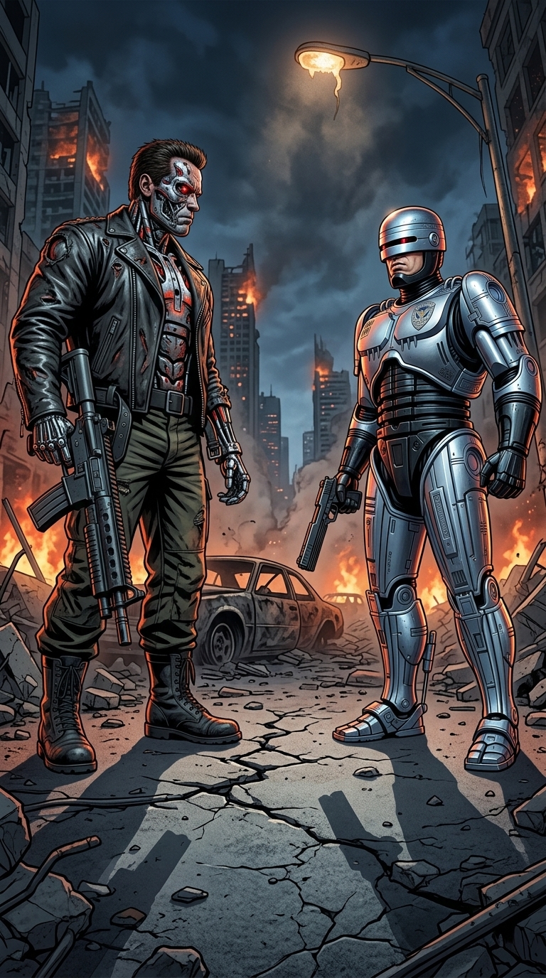 Art style: Человек зажигалка. Пустынная улица ночного мегаполиса, заваленная обломками бетона и остовами сгоревших автомобилей. В центре кадра две мощные фигуры стоят друг напротив друга, разделенные пространством в десять метров. Освещение создается мигающим уличным фонарем и далеким пожаром, отбрасывающим длинные, пугающие тени на потрескавшийся асфальт. Композиция — широкий общий план с экстремально низкого угла, подчеркивающий монументальность. Атмосфера предельного напряжения. Цветовая палитра состоит из глубоких серых, стальных и тревожных оранжевых оттенков. ━━━━━━━━━━━━━━━━━━━━━━━━━━━━━━━━━━━━━━ FINAL STYLE ENFORCEMENT (this is the authoritative rendering directive — it overrides any style wording elsewhere in the prompt): Render this image entirely in "Человек зажигалка" style. Match the lighting grammar, material response, colour science, level of realism / stylisation, line weight, and shading model typical of "Человек зажигалка". Keep the subject, composition, camera angle, lighting direction, and colour palette from the description above — but EVERY surface, skin, fabric, material, and environmental element must be rendered in the "Человек зажигалка" idiom, not in any other medium. Character appearance reference (MUST match exactly): - Terminator: Strong rule: style --- Человек зажигалка ---. Массивная фигура киборга T-800 с частично сорванной кожей на лице, обнажающей блестящий хромированный эндоскелет и светящийся ярко-красный глаз. Он одет в поношенную черную кожаную куртку и грубые армейские штаны. Выражение лица абсолютно холодное и механическое. Его поза выражает непоколебимую угрозу. Фон — разрушенный ночной город с горящими обломками и густым дымом. Освещение резкое, с холодными синими тенями и яркими красными отсветами от огня. Стиль — детализированный гиперреализм с акцентом на текстуру металла и поврежденной кожи. - RoboCop: Strong rule: style --- Человек зажигалка ---. Высокотехнологичный бронированный полицейский в серебристо-стальном корпусе с характерным узким визором. Нижняя часть лица человеческая, с решительно сжатыми губами и волевым подбородком. На груди отчетливо виден значок полиции Детройта. Он держит в руке модифицированный пистолет Auto-9. Фон — футуристический индустриальный пейзаж с дождем и неоновыми вывесками. Освещение мягкое, красиво отражающееся от полированного металла брони, с преобладанием холодных стальных и синих тонов. Стиль — детализированный реализм, подчеркивающий чистоту линий и мощь конструкции.