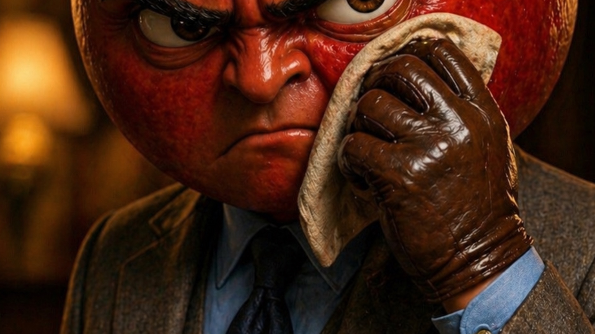 Cinematic 3D Pixar style close-up. A strict man with a pomegranate head stands in a dimly lit room with warm light. The camera slowly moves closer to his face. He angrily wipes his cheek with a cloth, rubbing off a thin painted layer from his skin. As the layer disappears, the true surface underneath is revealed — shiny red pomegranate seeds embedded inside the fruit, glistening under the light. The cloth becomes stained red. His expression remains cold and intense. Ultra detailed texture, dramatic lighting, cinematic atmosphere, vertical 9:16, high realism. No background voices, only subtle room ambience.