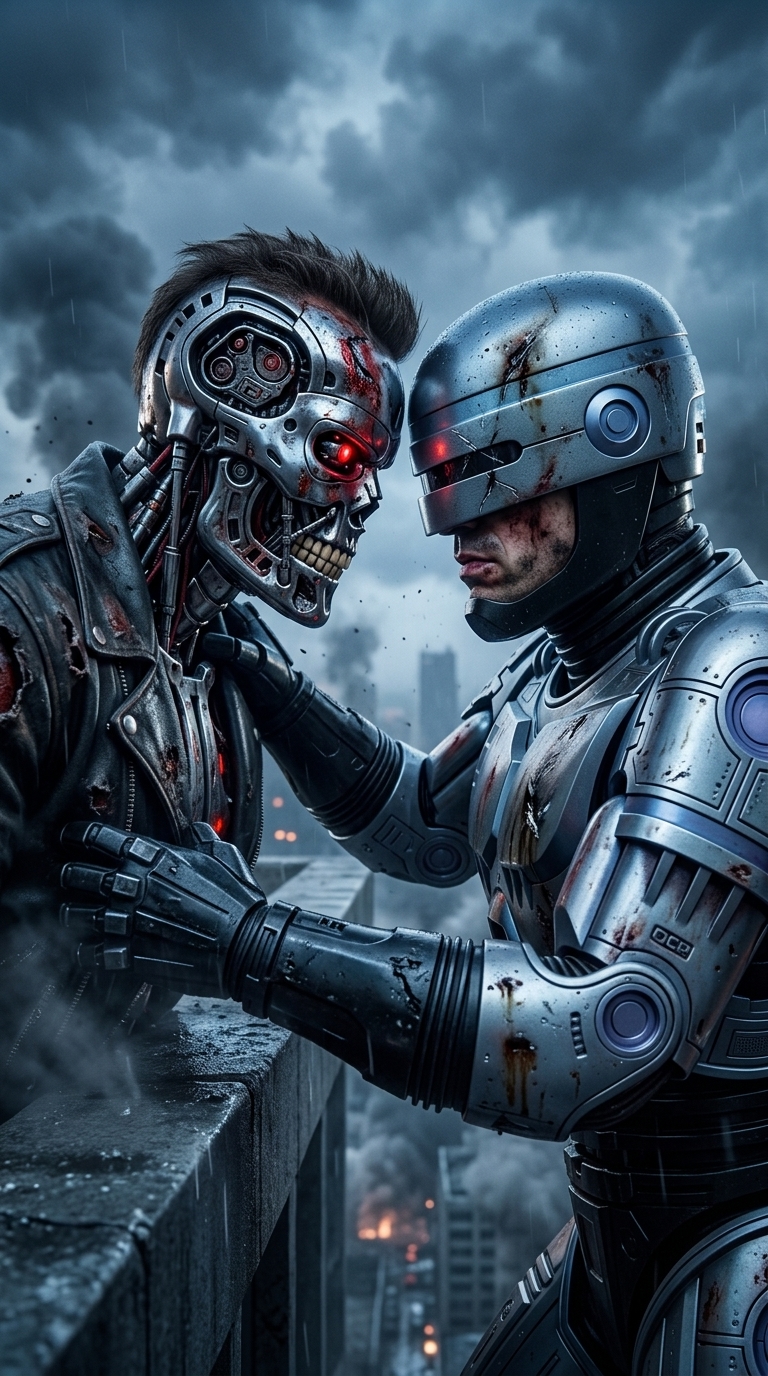 Art style: Человек зажигалка. Крыша высокого небоскреба на фоне предрассветного неба, затянутого густым промышленным смогом. Обе фигуры находятся в состоянии сильного износа, с видимыми повреждениями на корпусах. Они сцепились в последнем усилии на самом краю бетонного парапета. Композиция — драматичный крупный план лиц противников, смотрящих друг другу в глаза. Освещение — тусклый холодный свет раннего утра, пробивающийся сквозь клубы дыма. Атмосфера трагического величия. Палитра выдержана в приглушенных стальных и темно-синих тонах. ━━━━━━━━━━━━━━━━━━━━━━━━━━━━━━━━━━━━━━ FINAL STYLE ENFORCEMENT (this is the authoritative rendering directive — it overrides any style wording elsewhere in the prompt): Render this image entirely in "Человек зажигалка" style. Match the lighting grammar, material response, colour science, level of realism / stylisation, line weight, and shading model typical of "Человек зажигалка". Keep the subject, composition, camera angle, lighting direction, and colour palette from the description above — but EVERY surface, skin, fabric, material, and environmental element must be rendered in the "Человек зажигалка" idiom, not in any other medium. Character appearance reference (MUST match exactly): - Terminator: Strong rule: style --- Человек зажигалка ---. Массивная фигура киборга T-800 с частично сорванной кожей на лице, обнажающей блестящий хромированный эндоскелет и светящийся ярко-красный глаз. Он одет в поношенную черную кожаную куртку и грубые армейские штаны. Выражение лица абсолютно холодное и механическое. Его поза выражает непоколебимую угрозу. Фон — разрушенный ночной город с горящими обломками и густым дымом. Освещение резкое, с холодными синими тенями и яркими красными отсветами от огня. Стиль — детализированный гиперреализм с акцентом на текстуру металла и поврежденной кожи. - RoboCop: Strong rule: style --- Человек зажигалка ---. Высокотехнологичный бронированный полицейский в серебристо-стальном корпусе с характерным узким визором. Нижняя часть лица человеческая, с решительно сжатыми губами и волевым подбородком. На груди отчетливо виден значок полиции Детройта. Он держит в руке модифицированный пистолет Auto-9. Фон — футуристический индустриальный пейзаж с дождем и неоновыми вывесками. Освещение мягкое, красиво отражающееся от полированного металла брони, с преобладанием холодных стальных и синих тонов. Стиль — детализированный реализм, подчеркивающий чистоту линий и мощь конструкции.