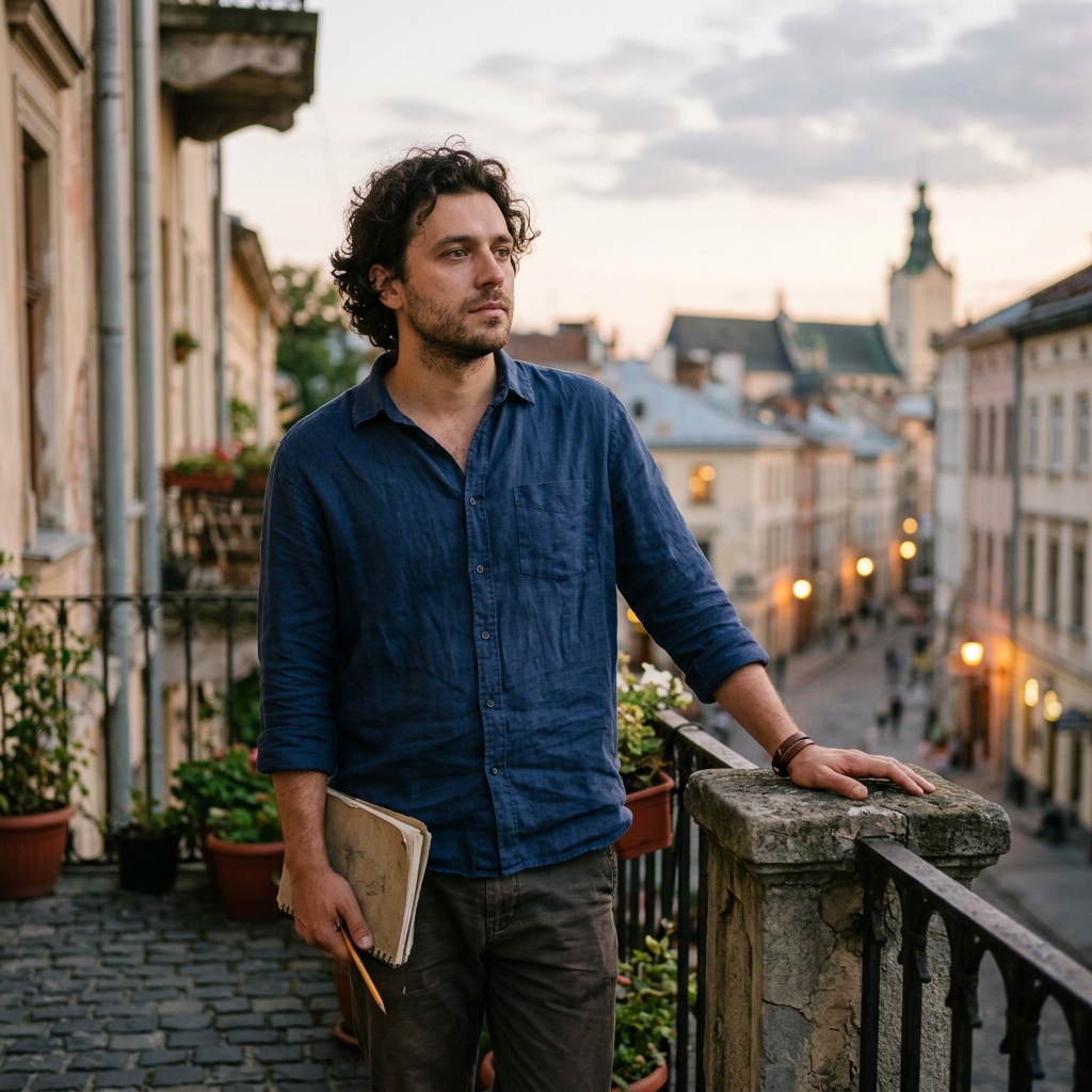Strong rule: style --- Кинематографичный, реалистичный стиль с мягким,... ---. Мужчина, около 30 лет, с задумчивым взглядом и легкой небритостью. Вьющиеся темные волосы. Одет более свободно, чем Дмитрий (льняная рубашка, брюки). В его образе есть что-то творческое и немного меланхоличное.