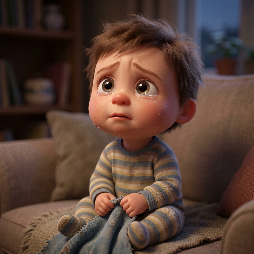 Strong rule: style --- 3D анимация в стиле Pixar ---. Маленький ребенок с круглой головой-картофелиной, большие слезящиеся глаза, маленькие ручки. Одет в полосатую пижаму или простую домашнюю одежду тусклых цветов. Кожа светлее, чем у отца, с более гладкой текстурой. Выражение лица выражает страх и надежду. Фон размыт, акцент на эмоциях ребенка. Стиль качественной компьютерной анимации.