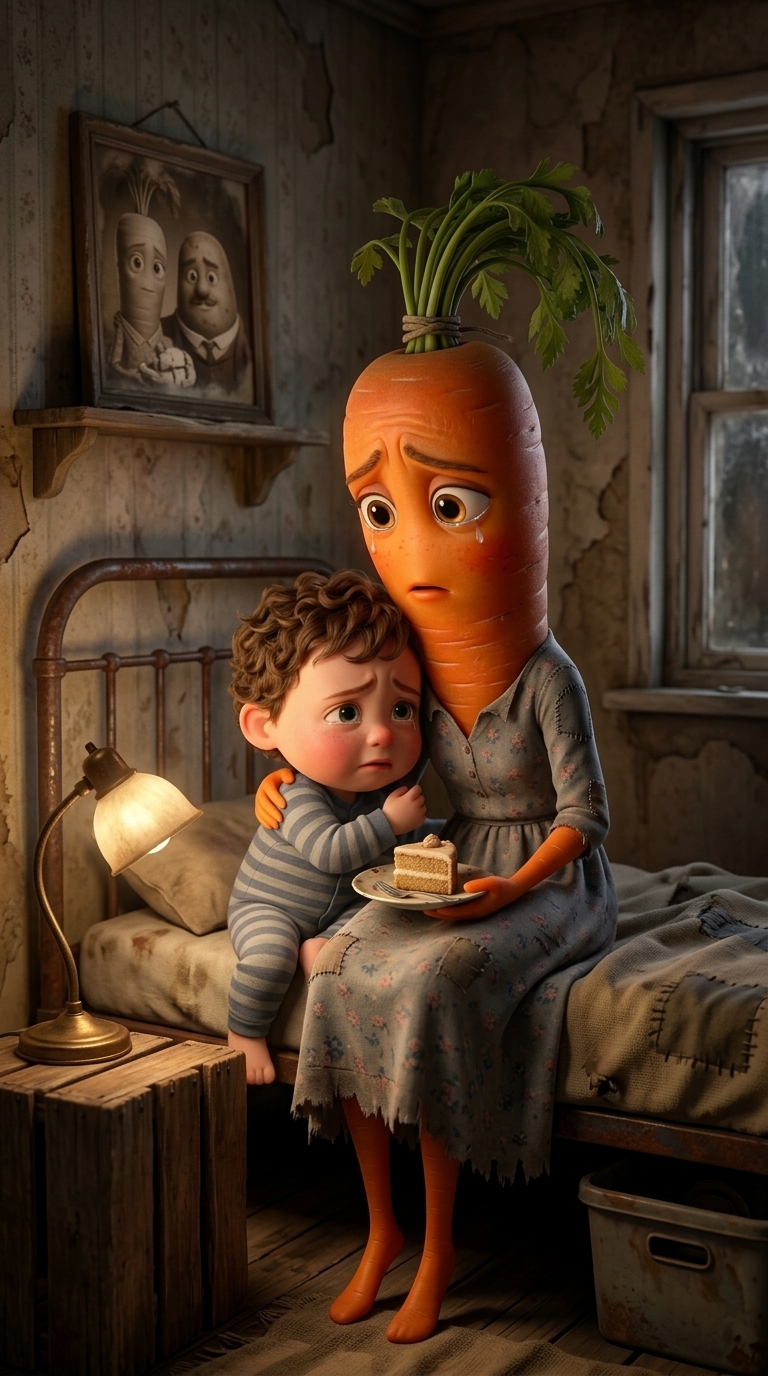 Art style: 3D анимация в стиле Pixar. Бедная спальня с железной кроватью. Мама-Морковь сидит на краю кровати, нежно обнимая плачущего Сына. В руках у нее маленькое блюдце с куском торта. В комнате царит атмосфера тихой печали, свет от настольной лампы мягко освещает их лица. На стене висит старая фотография. ━━━━━━━━━━━━━━━━━━━━━━━━━━━━━━━━━━━━━━ FINAL STYLE ENFORCEMENT (this is the authoritative rendering directive — it overrides any style wording elsewhere in the prompt): Render this image entirely in "3D анимация в стиле Pixar" style. Match the lighting grammar, material response, colour science, level of realism / stylisation, line weight, and shading model typical of "3D анимация в стиле Pixar". Keep the subject, composition, camera angle, lighting direction, and colour palette from the description above — but EVERY surface, skin, fabric, material, and environmental element must be rendered in the "3D анимация в стиле Pixar" idiom, not in any other medium. Character appearance reference (MUST match exactly): - Мама-Морковь: Strong rule: style --- 3D анимация в стиле Pixar ---. Стройная антропоморфная фигура с длинной оранжевой головой в форме моркови, на макушке пучок зеленых листьев. Большие выразительные глаза, полные грусти. Одета в выцветшее серое платье с мелким цветочным принтом и заплатками. Текстура кожи напоминает поверхность моркови. Окружение — бедная, плохо освещенная комната. Высококачественная 3D-графика с мягким освещением. - Сын: Strong rule: style --- 3D анимация в стиле Pixar ---. Strong rule: style --- 3D анимация в стиле Pixar ---. Strong rule: style --- 3D анимация в стиле Pixar ---. Маленький ребенок с круглой головой-картофелиной, большие слезящиеся глаза, маленькие ручки. Одет в полосатую пижаму или простую домашнюю одежду тусклых цветов. Кожа светлее, чем у отца, с более гладкой текстурой. Выражение лица выражает страх и надежду. Фон размыт, акцент на эмоциях ребенка. Стиль качественной компьютерной анимации.