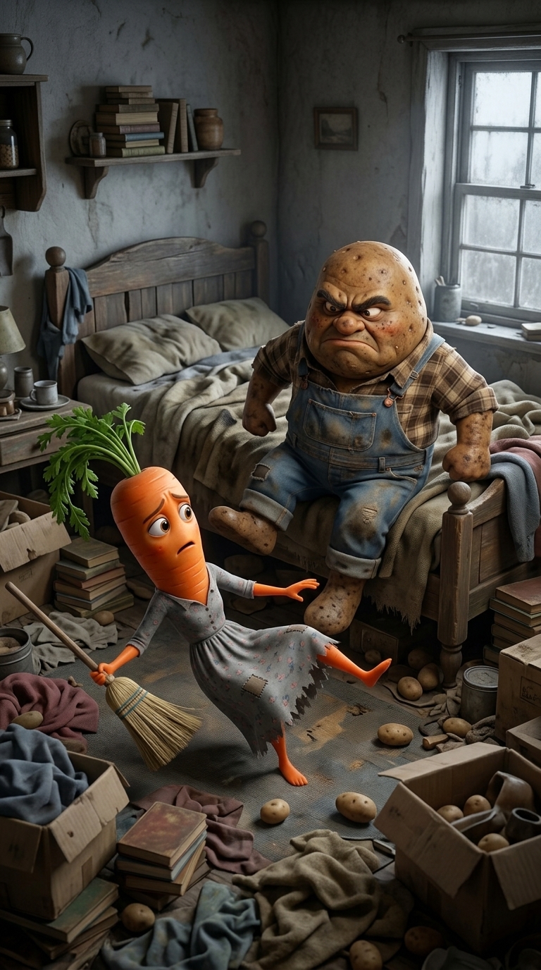 Art style: 3D анимация в стиле Pixar. Мама-Морковь подметает пол в комнате, где на кровати лежит Папа-Картофель. Она спотыкается о его ногу и падает. Папа-Картофель встает с кровати с раздраженным выражением лица. Комната захламлена старыми вещами, в окне виден тусклый дневной свет. ━━━━━━━━━━━━━━━━━━━━━━━━━━━━━━━━━━━━━━ FINAL STYLE ENFORCEMENT (this is the authoritative rendering directive — it overrides any style wording elsewhere in the prompt): Render this image entirely in "3D анимация в стиле Pixar" style. Match the lighting grammar, material response, colour science, level of realism / stylisation, line weight, and shading model typical of "3D анимация в стиле Pixar". Keep the subject, composition, camera angle, lighting direction, and colour palette from the description above — but EVERY surface, skin, fabric, material, and environmental element must be rendered in the "3D анимация в стиле Pixar" idiom, not in any other medium. Character appearance reference (MUST match exactly): - Папа-Картофель: Strong rule: style --- 3D анимация в стиле Pixar ---. Крупный антропоморфный персонаж с головой в виде большой коричневой картофелины, грубые черты лица, густые брови, маленькие злые глаза. Одет в грязный синий джинсовый комбинезон и старую клетчатую рубашку в коричневых тонах. Кожа имеет текстуру картофельной кожуры с мелкими пятнышками. Освещение в помещении тусклое и теплое, создающее драматичные тени. Стиль современной 3D-анимации с высокой детализацией текстур. - Мама-Морковь: Strong rule: style --- 3D анимация в стиле Pixar ---. Стройная антропоморфная фигура с длинной оранжевой головой в форме моркови, на макушке пучок зеленых листьев. Большие выразительные глаза, полные грусти. Одета в выцветшее серое платье с мелким цветочным принтом и заплатками. Текстура кожи напоминает поверхность моркови. Окружение — бедная, плохо освещенная комната. Высококачественная 3D-графика с мягким освещением.