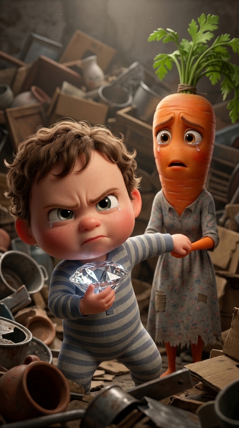 Art style: 3D анимация в стиле Pixar. Крупный план лица Сына. Его выражение внезапно меняется с радостного на злое и жадное. Он прижимает бриллиант к груди, отстраняясь от матери. На заднем плане видна удивленная и расстроенная Мама-Морковь на фоне гор мусора. ━━━━━━━━━━━━━━━━━━━━━━━━━━━━━━━━━━━━━━ FINAL STYLE ENFORCEMENT (this is the authoritative rendering directive — it overrides any style wording elsewhere in the prompt): Render this image entirely in "3D анимация в стиле Pixar" style. Match the lighting grammar, material response, colour science, level of realism / stylisation, line weight, and shading model typical of "3D анимация в стиле Pixar". Keep the subject, composition, camera angle, lighting direction, and colour palette from the description above — but EVERY surface, skin, fabric, material, and environmental element must be rendered in the "3D анимация в стиле Pixar" idiom, not in any other medium. Character appearance reference (MUST match exactly): - Мама-Морковь: Strong rule: style --- 3D анимация в стиле Pixar ---. Стройная антропоморфная фигура с длинной оранжевой головой в форме моркови, на макушке пучок зеленых листьев. Большие выразительные глаза, полные грусти. Одета в выцветшее серое платье с мелким цветочным принтом и заплатками. Текстура кожи напоминает поверхность моркови. Окружение — бедная, плохо освещенная комната. Высококачественная 3D-графика с мягким освещением. - Сын: Strong rule: style --- 3D анимация в стиле Pixar ---. Strong rule: style --- 3D анимация в стиле Pixar ---. Strong rule: style --- 3D анимация в стиле Pixar ---. Маленький ребенок с круглой головой-картофелиной, большие слезящиеся глаза, маленькие ручки. Одет в полосатую пижаму или простую домашнюю одежду тусклых цветов. Кожа светлее, чем у отца, с более гладкой текстурой. Выражение лица выражает страх и надежду. Фон размыт, акцент на эмоциях ребенка. Стиль качественной компьютерной анимации.
