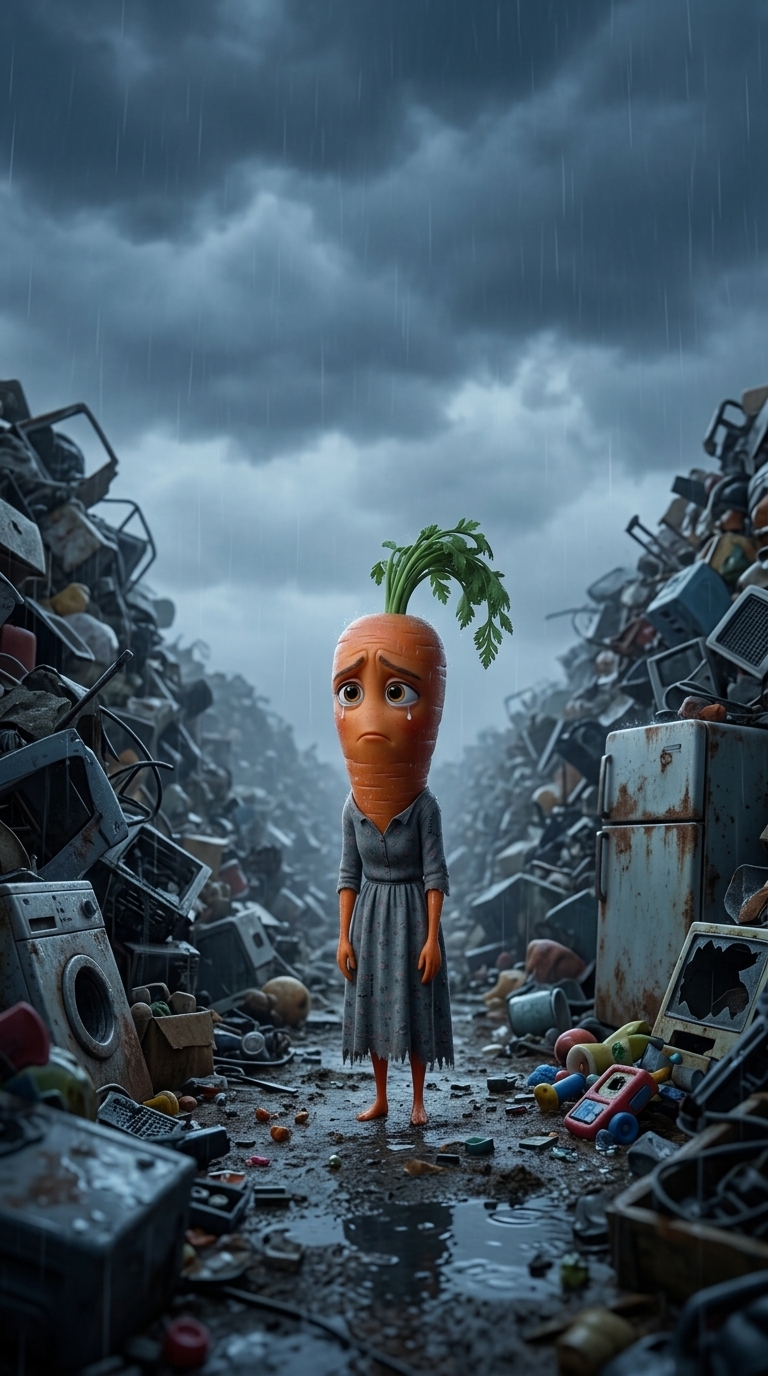 Art style: 3D анимация в стиле Pixar. Мама-Морковь стоит одна посреди свалки. Ее плечи опущены, на лице застыла маска глубокого горя. Небо становится еще темнее, начинает накрапывать дождь. Она выглядит крошечной и беззащитной среди огромного мира отходов. ━━━━━━━━━━━━━━━━━━━━━━━━━━━━━━━━━━━━━━ FINAL STYLE ENFORCEMENT (this is the authoritative rendering directive — it overrides any style wording elsewhere in the prompt): Render this image entirely in "3D анимация в стиле Pixar" style. Match the lighting grammar, material response, colour science, level of realism / stylisation, line weight, and shading model typical of "3D анимация в стиле Pixar". Keep the subject, composition, camera angle, lighting direction, and colour palette from the description above — but EVERY surface, skin, fabric, material, and environmental element must be rendered in the "3D анимация в стиле Pixar" idiom, not in any other medium. Character appearance reference (MUST match exactly): - Мама-Морковь: Strong rule: style --- 3D анимация в стиле Pixar ---. Стройная антропоморфная фигура с длинной оранжевой головой в форме моркови, на макушке пучок зеленых листьев. Большие выразительные глаза, полные грусти. Одета в выцветшее серое платье с мелким цветочным принтом и заплатками. Текстура кожи напоминает поверхность моркови. Окружение — бедная, плохо освещенная комната. Высококачественная 3D-графика с мягким освещением.