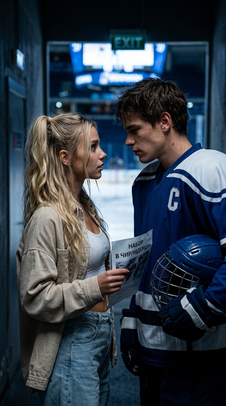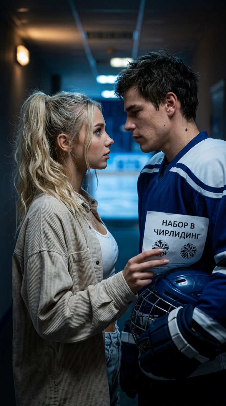 Art style: Кинематографичный, реалистичная съемка, драмати.... Общий план: светлый танцевальный зал. 10-12 девушек в спортивной форме синхронно выполняют танцевальные движения. На переднем плане за столом сидят двое судей и делают пометки в блокнотах. ━━━━━━━━━━━━━━━━━━━━━━━━━━━━━━━━━━━━━━ FINAL STYLE ENFORCEMENT (this is the authoritative rendering directive — it overrides any style wording elsewhere in the prompt): Render this image entirely in "Кинематографичный, реалистичная съемка, драмати..." style. Match the lighting grammar, material response, colour science, level of realism / stylisation, line weight, and shading model typical of "Кинематографичный, реалистичная съемка, драмати...". Keep the subject, composition, camera angle, lighting direction, and colour palette from the description above — but EVERY surface, skin, fabric, material, and environmental element must be rendered in the "Кинематографичный, реалистичная съемка, драмати..." idiom, not in any other medium. Character appearance reference (MUST match exactly): - Василиса: Молодая девушка около 20 лет с овальным лицом и ровным золотистым загаром. У неё длинные светлые волнистые волосы, собранные в высокий небрежный хвост, с несколькими прядями, обрамляющими лицо. Глаза светло-голубые, взгляд спокойный и уверенный. Телосложение атлетичное и стройное, с выраженным рельефом пресса. Она одета в объемную джинсовую куртку светло-голубого цвета с едва заметным принтом, белый трикотажный кроп-топ и широкие джинсы с высокой посадкой в тон куртке. На ногах белые массивные кроссовки. Поза расслабленная, руки в карманах, выражение лица невозмутимое и притягательное. - Кира: Молодая женщина около 20 лет с атлетичным телосложением и светлой кожей. У нее овальное лицо с высокими скулами, полными губами и пронзительными серо-зелеными глазами. Темно-каштановые волосы собраны в высокий небрежный хвост, несколько прядей обрамляют лицо. Она одета в детализированную форму чирлидерши темно-синего и голубого цветов с надписью «СЕВЕРНЫЕ ВОЛКИ», включающую кроп-топ с вырезом на груди, длинные прозрачные рукава со стразами и плиссированную мини-юбку. Выражение лица серьезное и сосредоточенное, поза фронтальная и уверенная, в руках сине-серебристые помпоны.