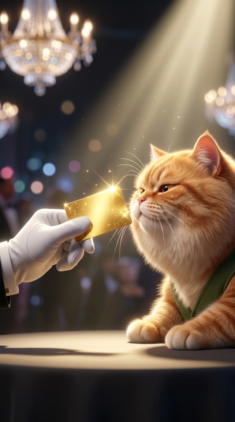 Art style: 3D Pixar. Крупный план на подиуме: элегантная мужская рука в белой перчатке протягивает сияющую золотую карту коту. Маркиз, прищурив глаза, с любопытством тянется мордочкой к блестящему предмету. Освещение сфокусировано узким лучом, создавая яркие блики на золоте. Фон мягко размыт, видны огни вечернего зала. Настроение комичное и статусное. Цвета: искрящееся золото, кремовый и угольно-черный. ━━━━━━━━━━━━━━━━━━━━━━━━━━━━━━━━━━━━━━ FINAL STYLE ENFORCEMENT (this is the authoritative rendering directive — it overrides any style wording elsewhere in the prompt): Render this image entirely in "3D Pixar" style. Match the lighting grammar, material response, colour science, level of realism / stylisation, line weight, and shading model typical of "3D Pixar". Keep the subject, composition, camera angle, lighting direction, and colour palette from the description above — but EVERY surface, skin, fabric, material, and environmental element must be rendered in the "3D Pixar" idiom, not in any other medium. Character appearance reference (MUST match exactly): - Маркиз: Strong rule: style --- 3D Pixar ---. Strong rule: style --- 3D Pixar ---. Крупный, очень упитанный рыжий кот с невероятно густой и пушистой шерстью огненного оттенка, переходящей в кремовый на животе. одет в жилетку. У него широкая морда с большими янтарными глазами, выражающими хитрость, и длинными белыми усами. Розовый нос и маленькие ушки дополняют образ. Кот выглядит самодовольным и крайне ленивым. Он изображен на фоне старого причала с размытыми деталями моря и лодок. Освещение мягкое, золотистого часа, подчеркивающее каждую ворсинку меха. Стиль напоминает детальную цифровую иллюстрацию с акцентом на текстуру шерсти и объем тела. Общая атмосфера ироничная и уютная. - Директор: Strong rule: style --- 3D Pixar ---. Мужчина средних лет, около 50 лет, с благородной сединой на висках и аккуратно подстриженной бородкой. У него добрые, но проницательные глаза и легкая улыбка. Одет в безупречный черный смокинг с атласными лацканами, белоснежную рубашку и черную бабочку. Его движения уверенные, грациозные и полны уважения. Фон — роскошный банкетный зал с хрустальными люстрами. Освещение теплое, создающее атмосферу элитного закрытого мероприятия. Стиль: реалистичный портрет, классическая композиция, глубокие контрасты и мягкие тени.