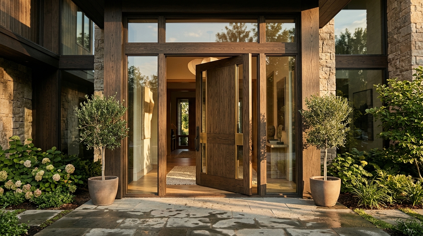 Art style: Кинематографический реализм. Парадная дверь роскошного современного особняка. Утренний солнечный свет. Дверь начинает медленно открываться. Камера смотрит прямо на нее. Стиль - кинематографический реализм, теплые тона. ━━━━━━━━━━━━━━━━━━━━━━━━━━━━━━━━━━━━━━ FINAL STYLE ENFORCEMENT (this is the authoritative rendering directive — it overrides any style wording elsewhere in the prompt): Render this image entirely in "Кинематографический реализм" style. Match the lighting grammar, material response, colour science, level of realism / stylisation, line weight, and shading model typical of "Кинематографический реализм". Keep the subject, composition, camera angle, lighting direction, and colour palette from the description above — but EVERY surface, skin, fabric, material, and environmental element must be rendered in the "Кинематографический реализм" idiom, not in any other medium.