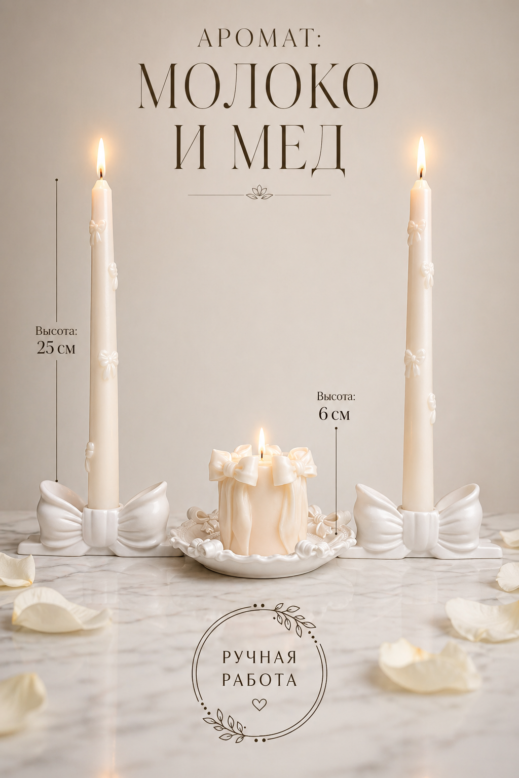 rompt: Professional e-commerce infographic. The candle set is arranged symmetrically and parallel on a light marble surface, exactly like the second slide. Two tall white taper candles (25 cm) are placed in white matte-finish bow holders, and one central pillar candle (6 cm) with wax bows is on the ornate plate. All candles are lit with bright, warm golden flames. High contrast Pinterest aesthetic with a clean neutral background and scattered white rose petals. Text overlay in a tall, elegant serif font at the top: "Аромат: Молоко и мед". Minimalist dimension lines indicate "Высота: 25 см" and "Высота: 6 см". A delicate circular logo with "РУЧНАЯ РАБОТА" is at the bottom. 8k resolution, sharp focus on the velvety matte texture and the fire.