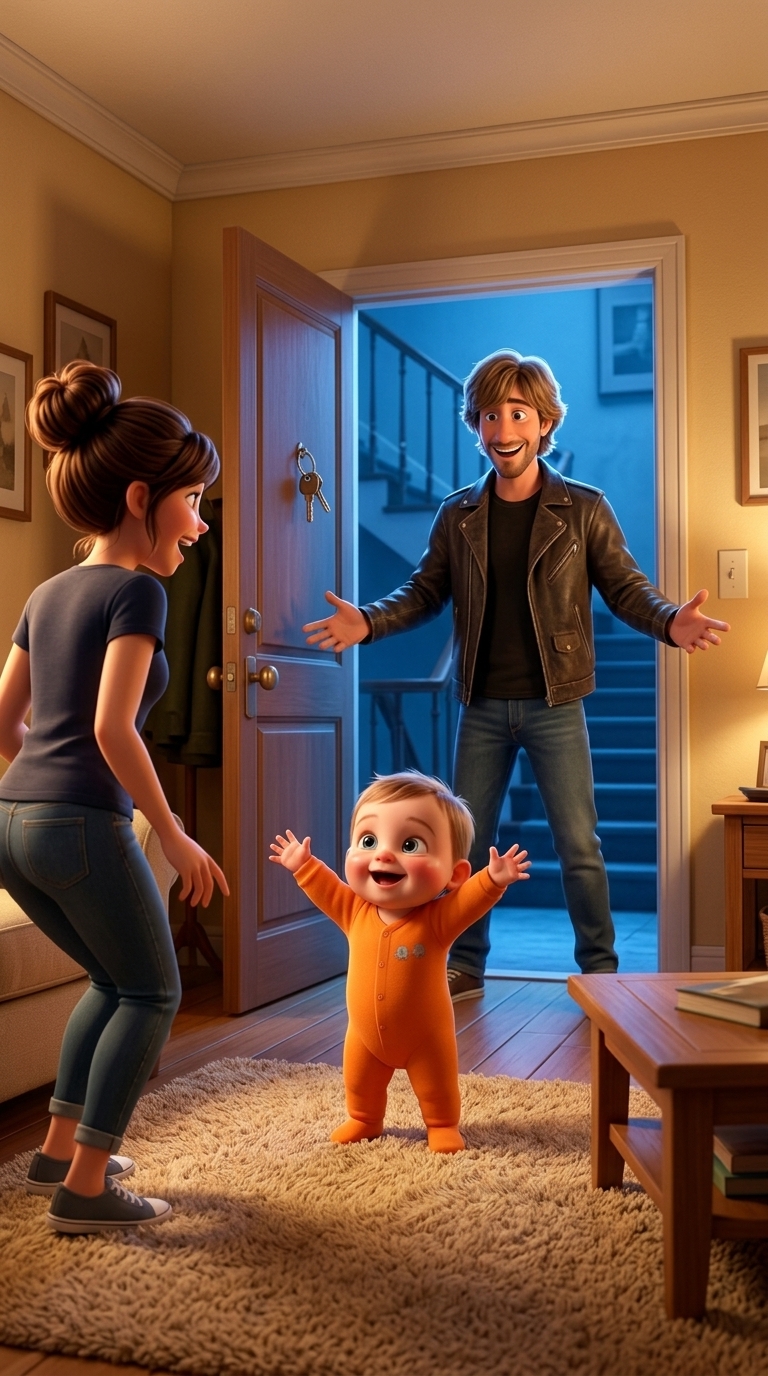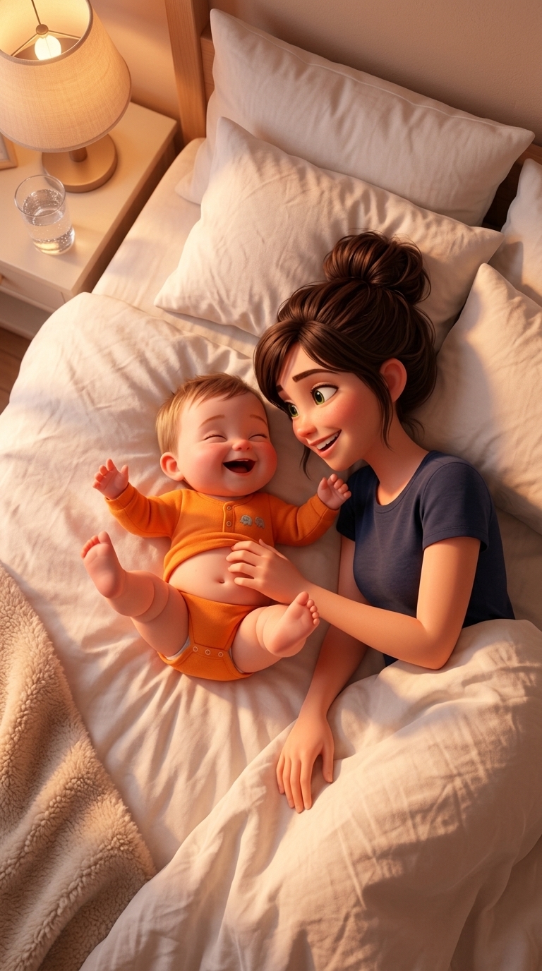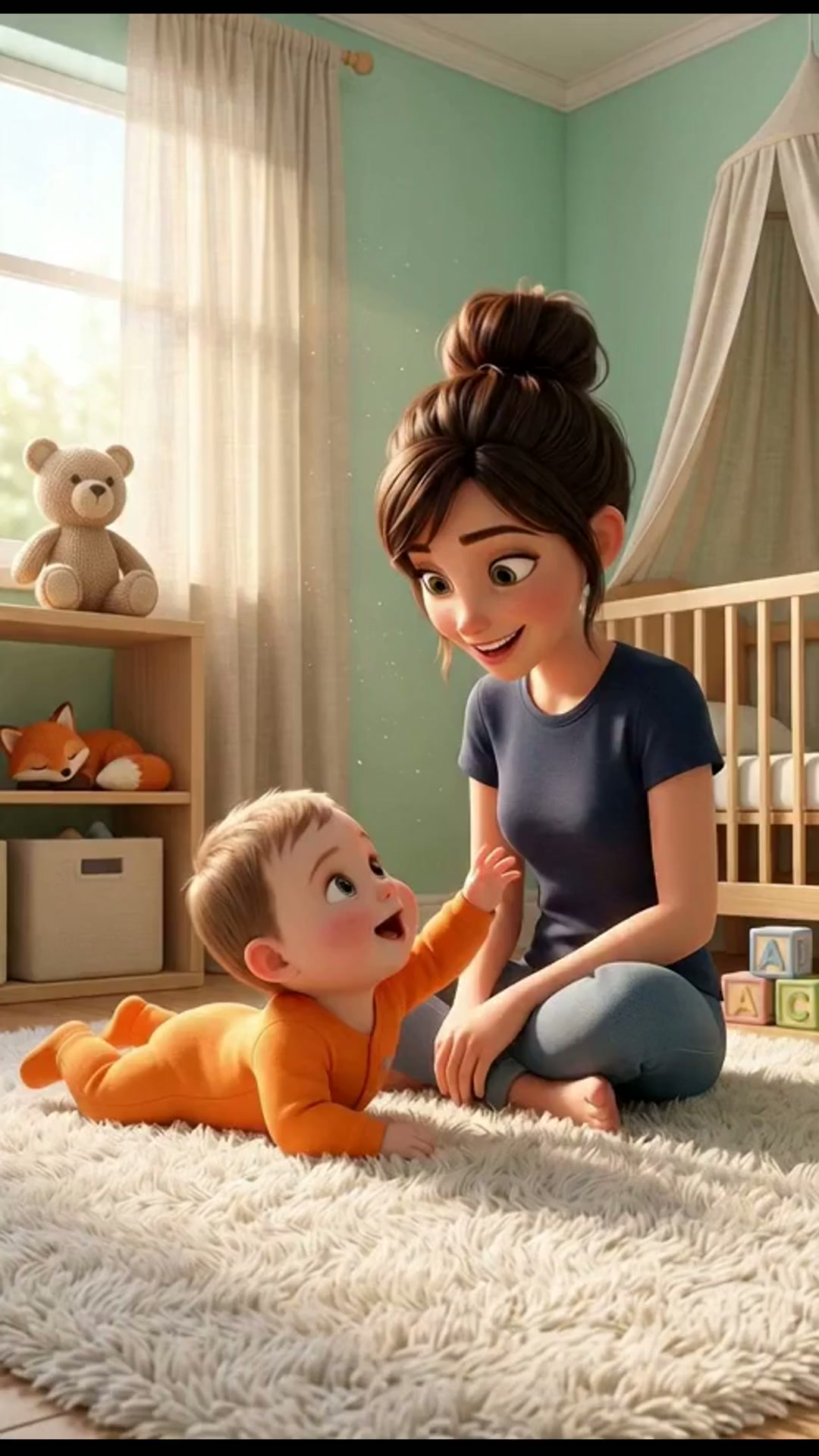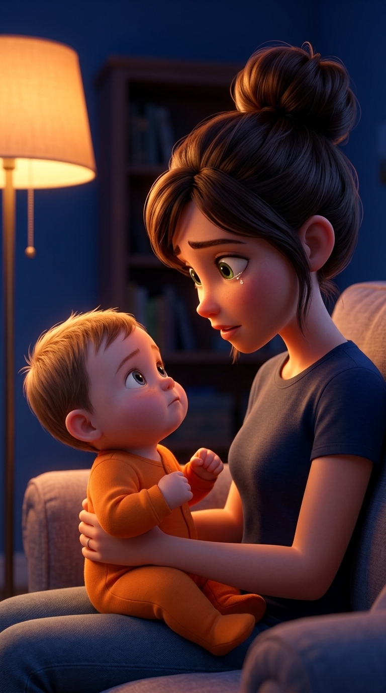 Strong rule: style --- 3D Pixar ---. Молодая женщина около двадцати лет с овальной формой лица и светлой кожей, имеющей теплый оттенок. Её темно-каштановые волосы собраны в высокий небрежный пучок, а несколько тонких прядей мягко обрамляют лицо. У неё выразительные зеленые глаза и прямой, уверенный взгляд. Она обладает стройным телосложением и одета в простую темно-синюю футболку с коротким рукавом. На лице застыла легкая, загадочная улыбка, поза фронтальная и спокойная.