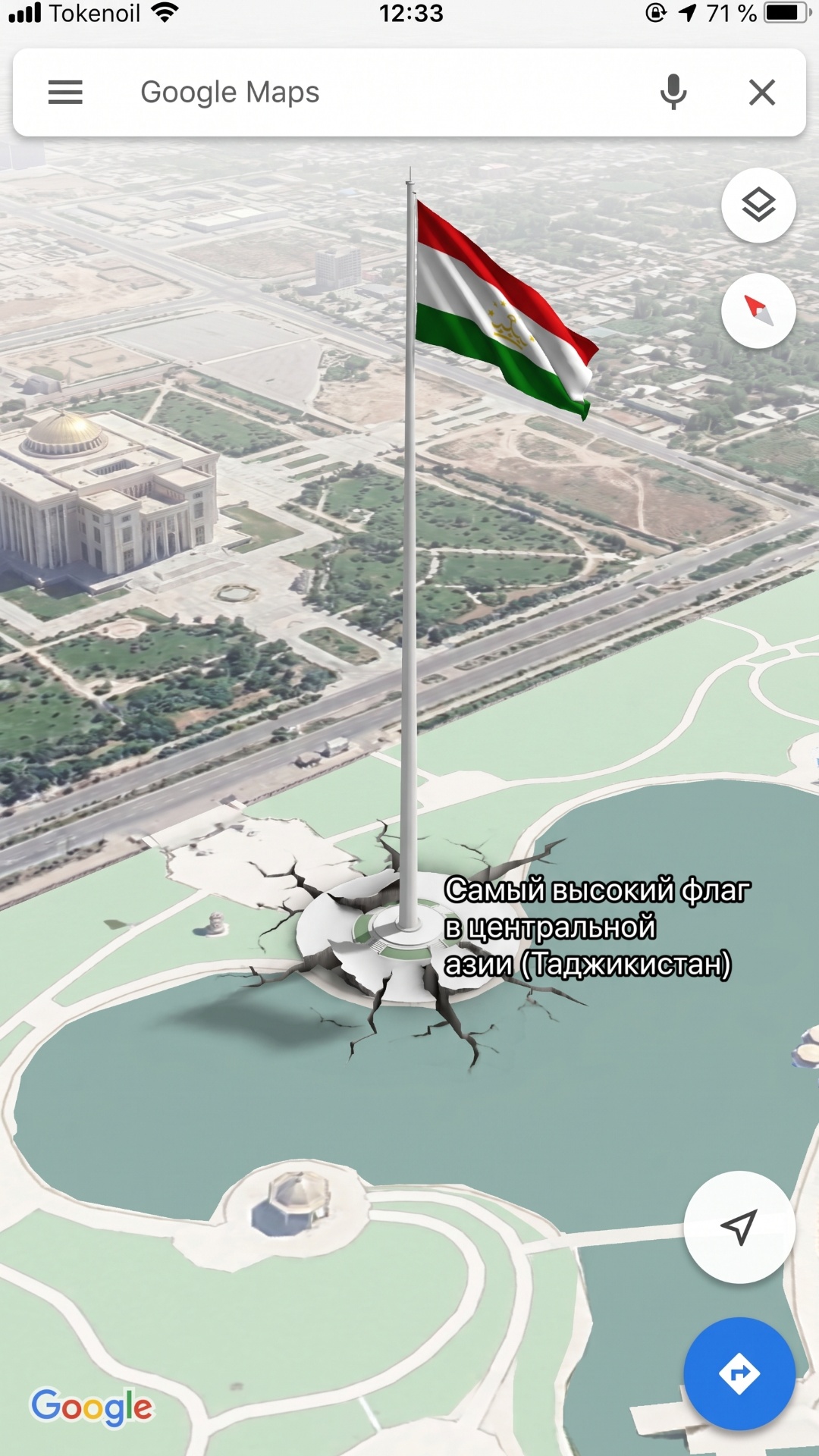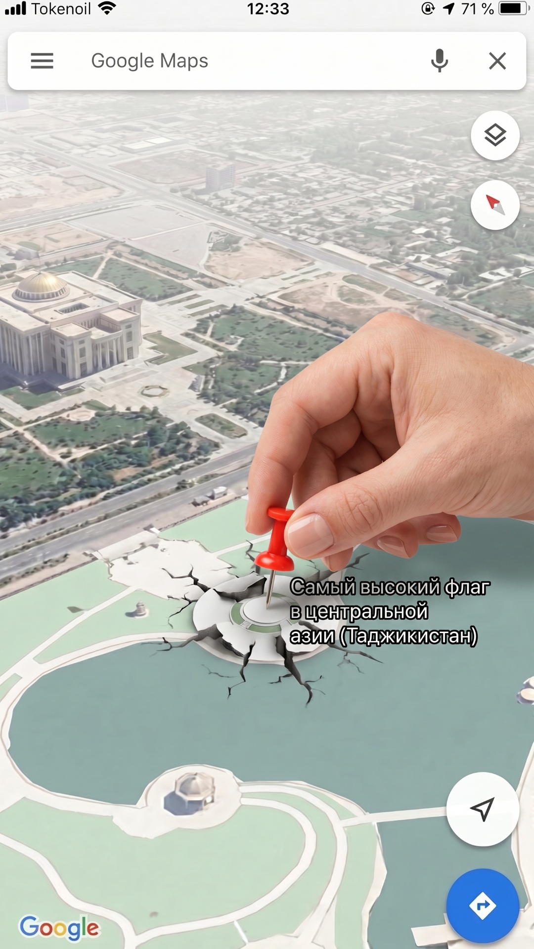 Start with a realistic miniature version of Самый высокий флаг в центральной азии (Таджикистан) on a Google Maps surface. The camera begi...