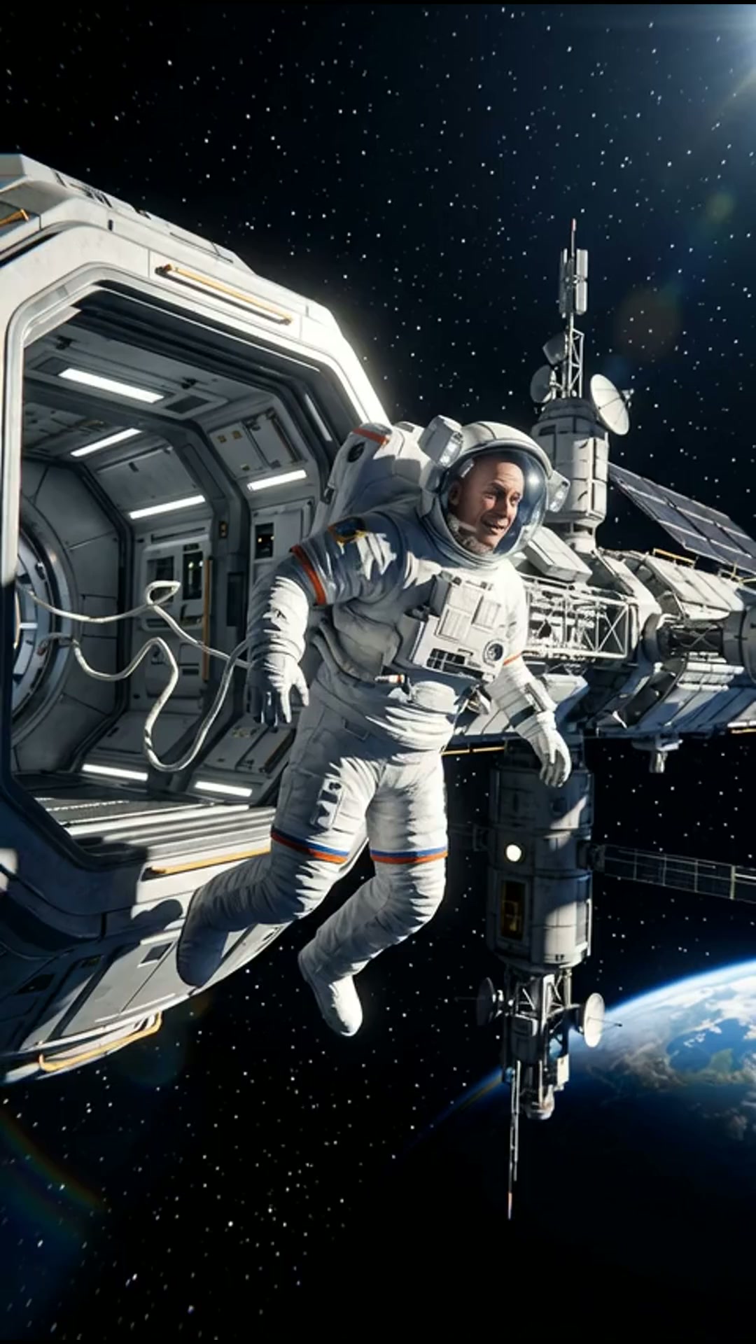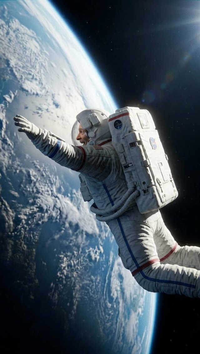 Плавный наезд камеры на астронавта, парящего высоко над голубой планетой, создавая ощущение огромного пространства и высоты.