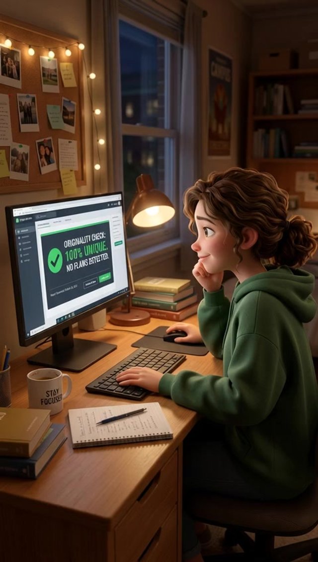 Камера следует от студента за текстом, который плавно перемещается, акцентируя внимание на качестве проверки.
