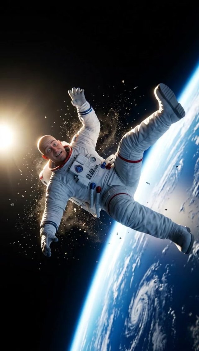 Динамичное вращение камеры вокруг астронавта, который пытается увернуться от невидимых опасностей в вакууме, постепенное приближение к ат...