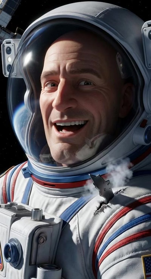 Резкое приближение камеры к лицу астронавта, момент столкновения с космическим мусором показан с эффектом замедленного времени для драмат...