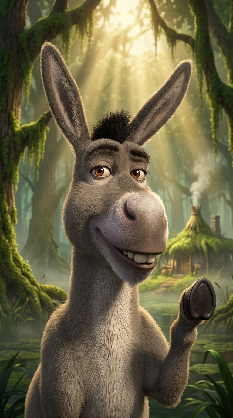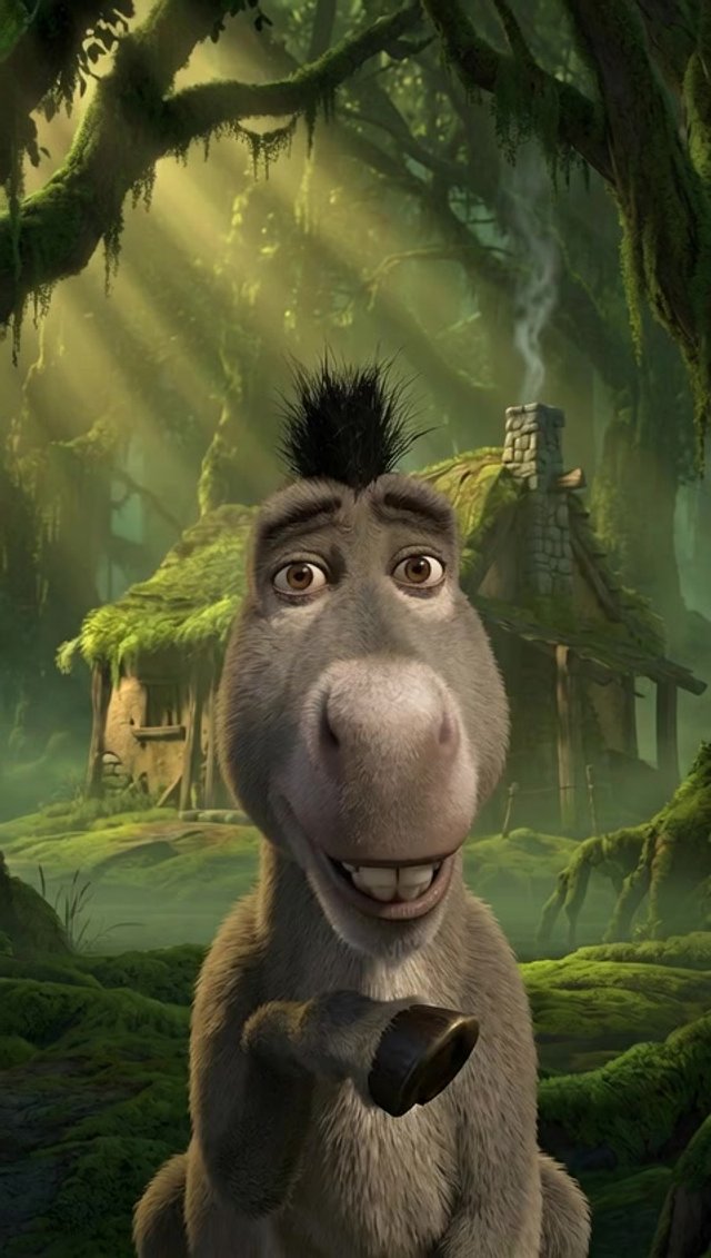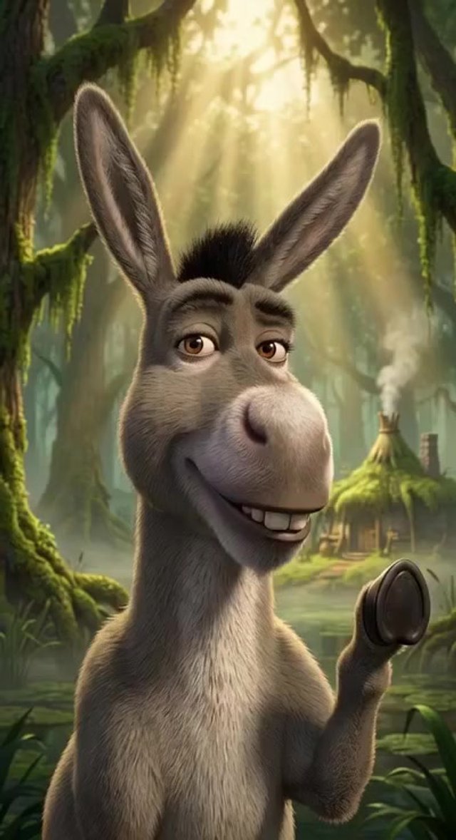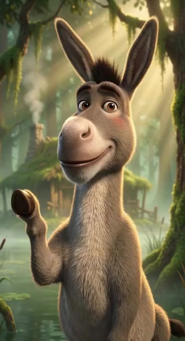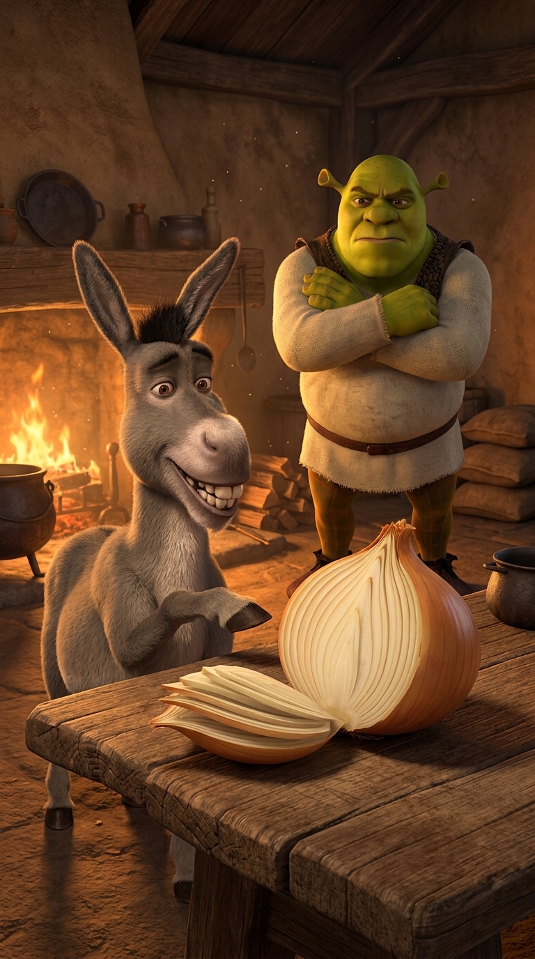 Ослик театрально разводит копытом, указывая на луковицу, а затем на Шрека. Шрек на заднем плане закатывает глаза. Пылинки танцуют в лучах...