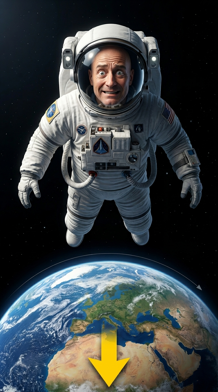 Камера отдаляется, показывая всю планету целиком и схематичное движение астронавта по круговой орбите, подчеркивая действие гравитации.