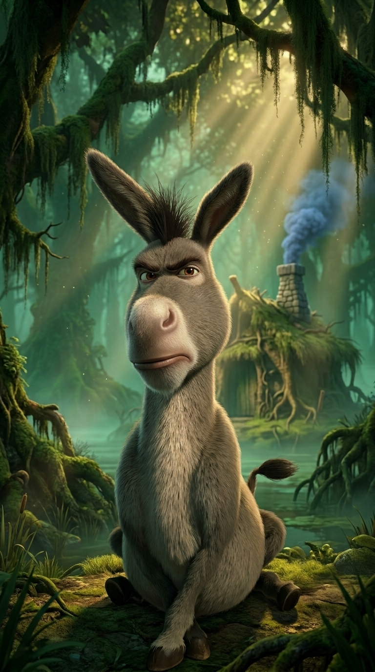 Крупный план говорящего ослика на фоне туманного зеленого болота. На заднем плане видна хижина огра с дымящейся тру...