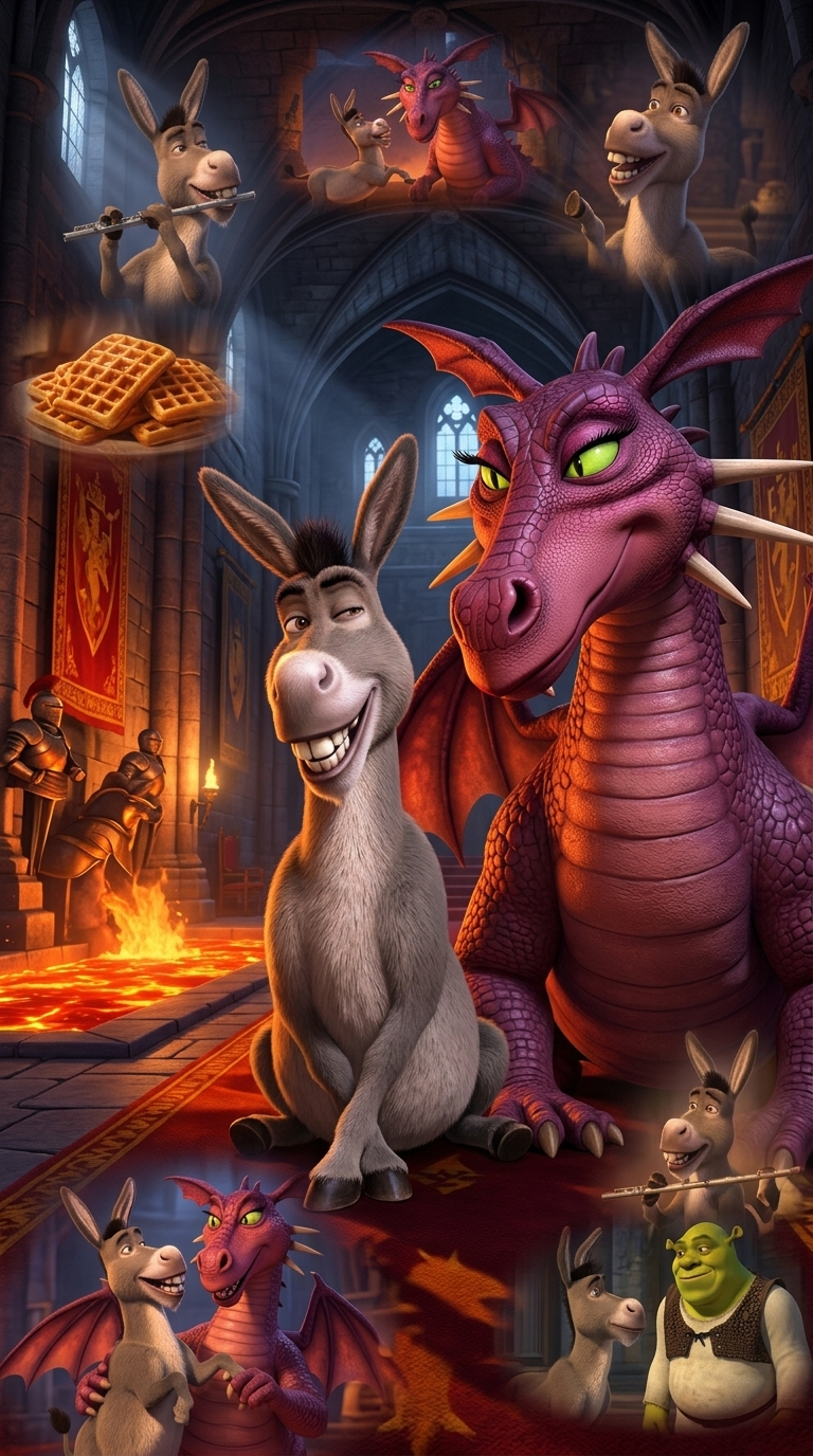 Яркий коллаж из воспоминаний ослика: он подмигивает рядом с огромной красной драконихой в готическом замке с высоки...