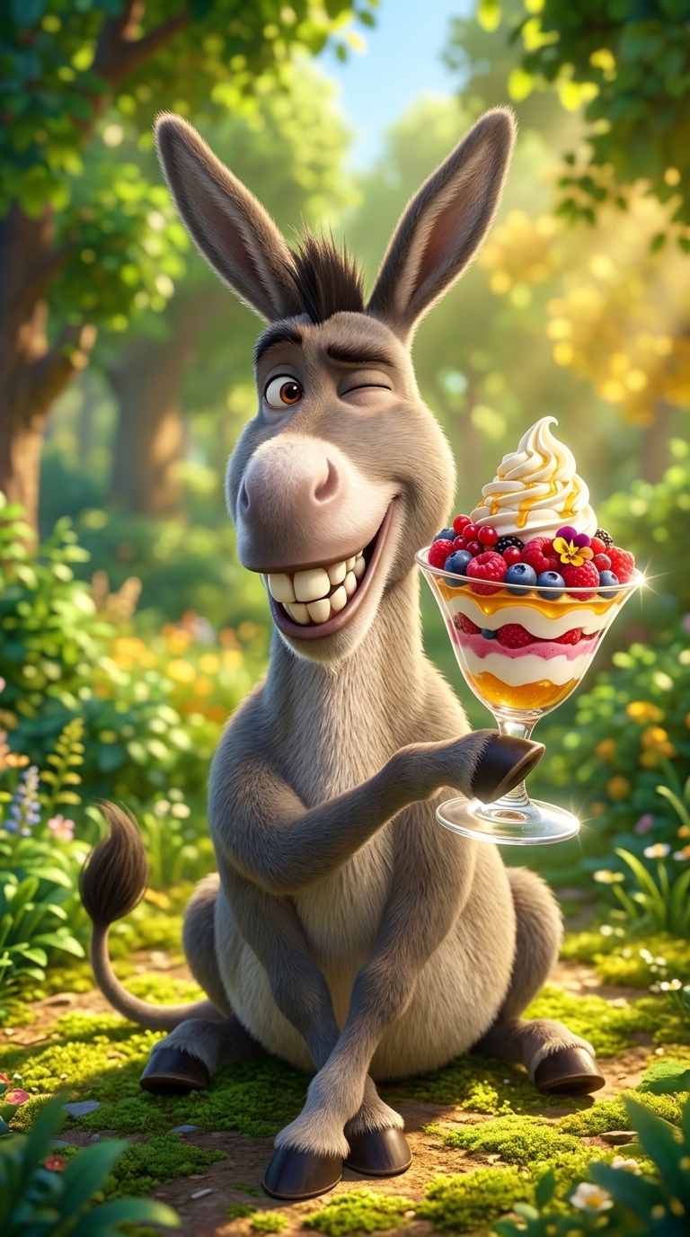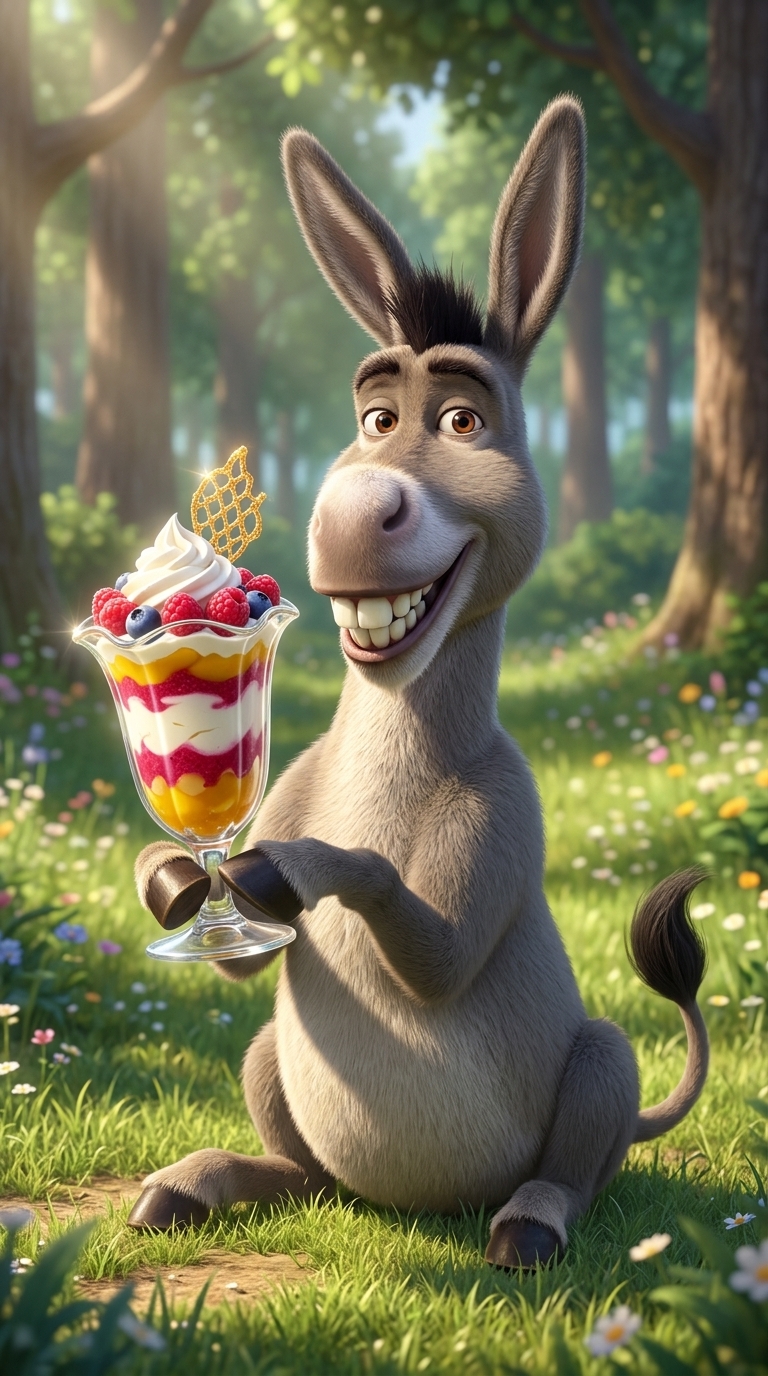 Солнечная лесная поляна, где ослик держит в копытах изящный стеклянный бокал с многослойным десертом парфе, украшен...