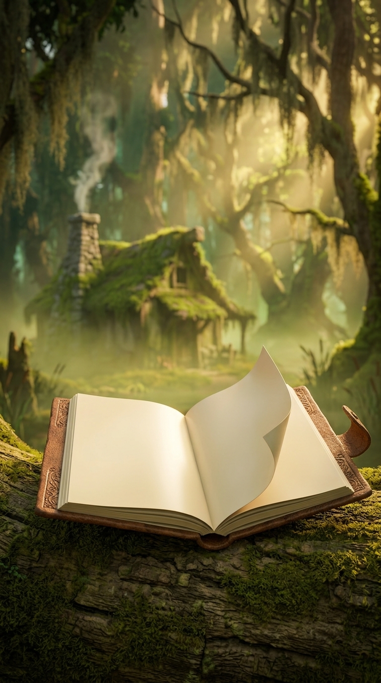 Крупный план открытого альбома с чистыми листами, он уже выглядит как центральный элемент истории. Камера остаётся ...