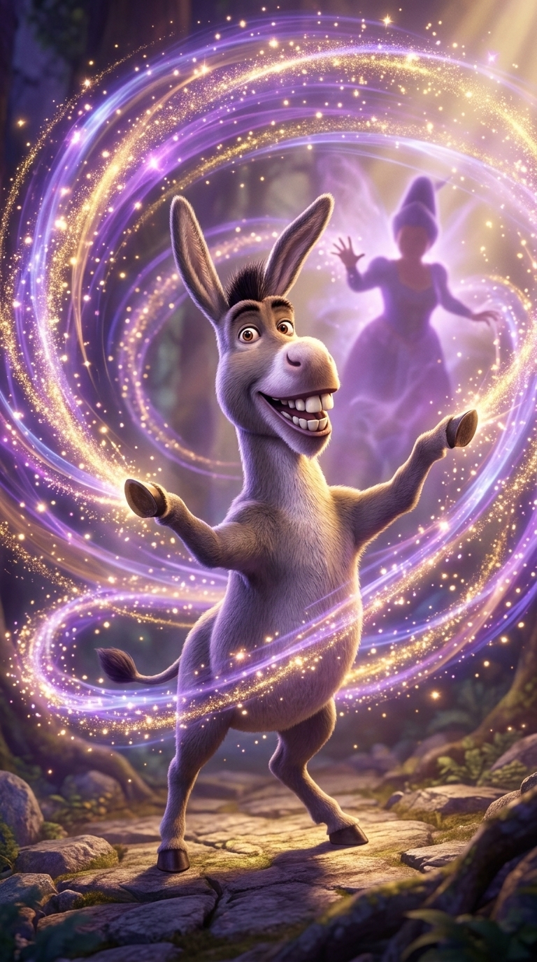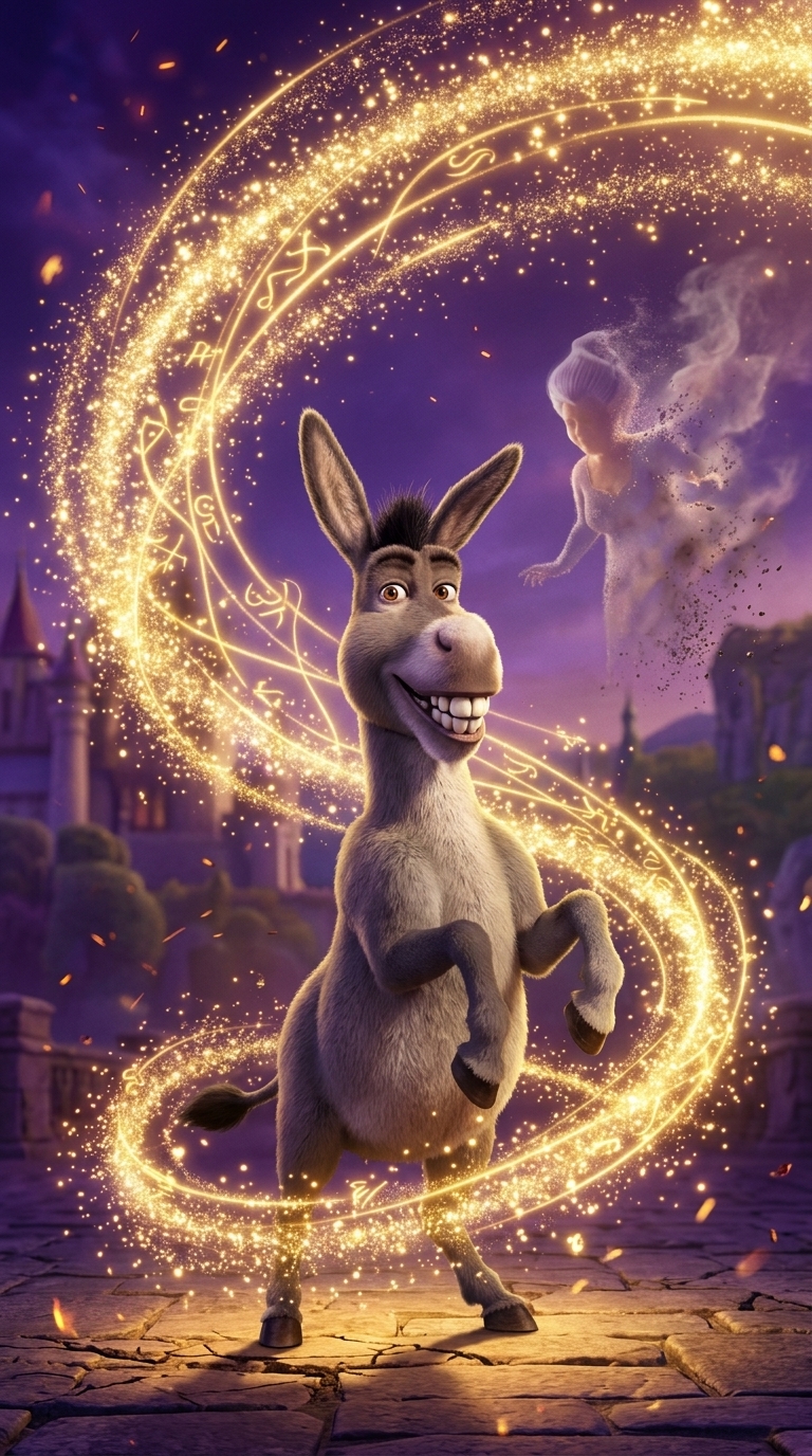Магические золотые искры кружатся вокруг ослика, формируя вращающиеся спирали и символы. Он сначала наблюдает за ними с лёгкой улыбкой, з...