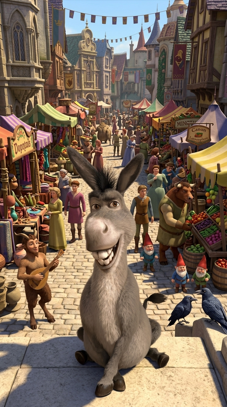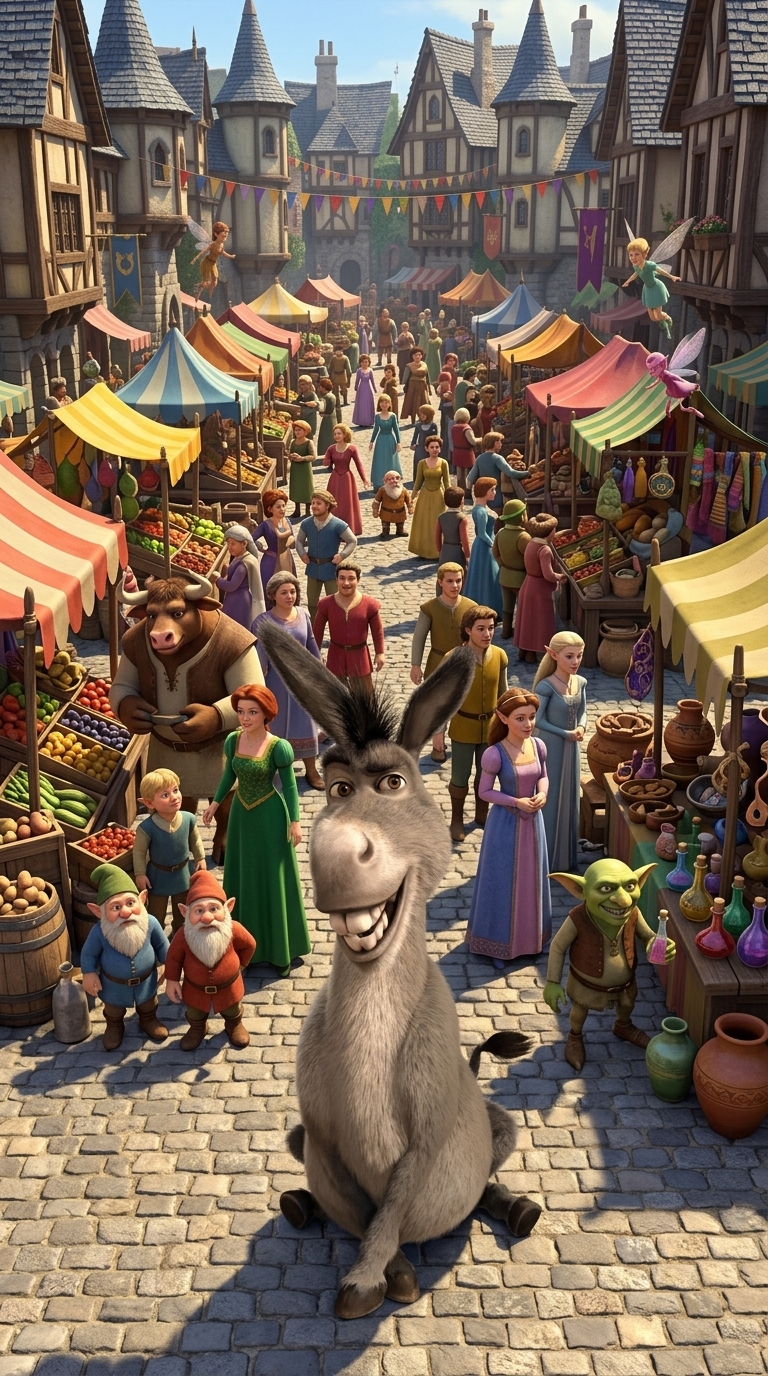 Оживленная рыночная площадь в сказочном городке, заполненная разнообразными людьми и сказочными существами. Ослик с...