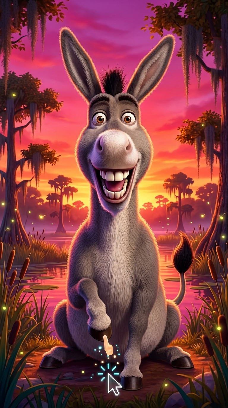 Ослик доверительно наклоняется к камере, его мимика выражает искреннее желание помочь. Он подмигивает и делает приглашающий жест головой....