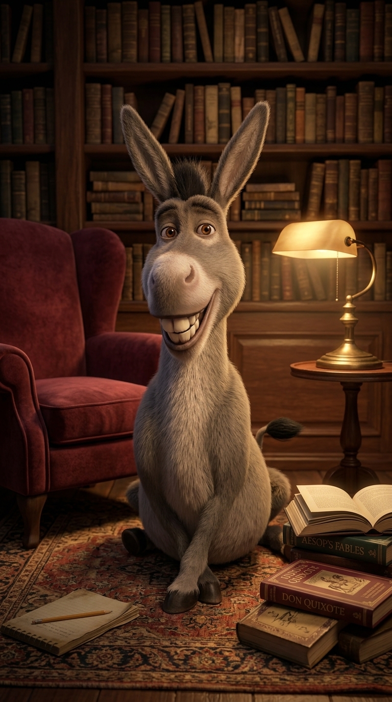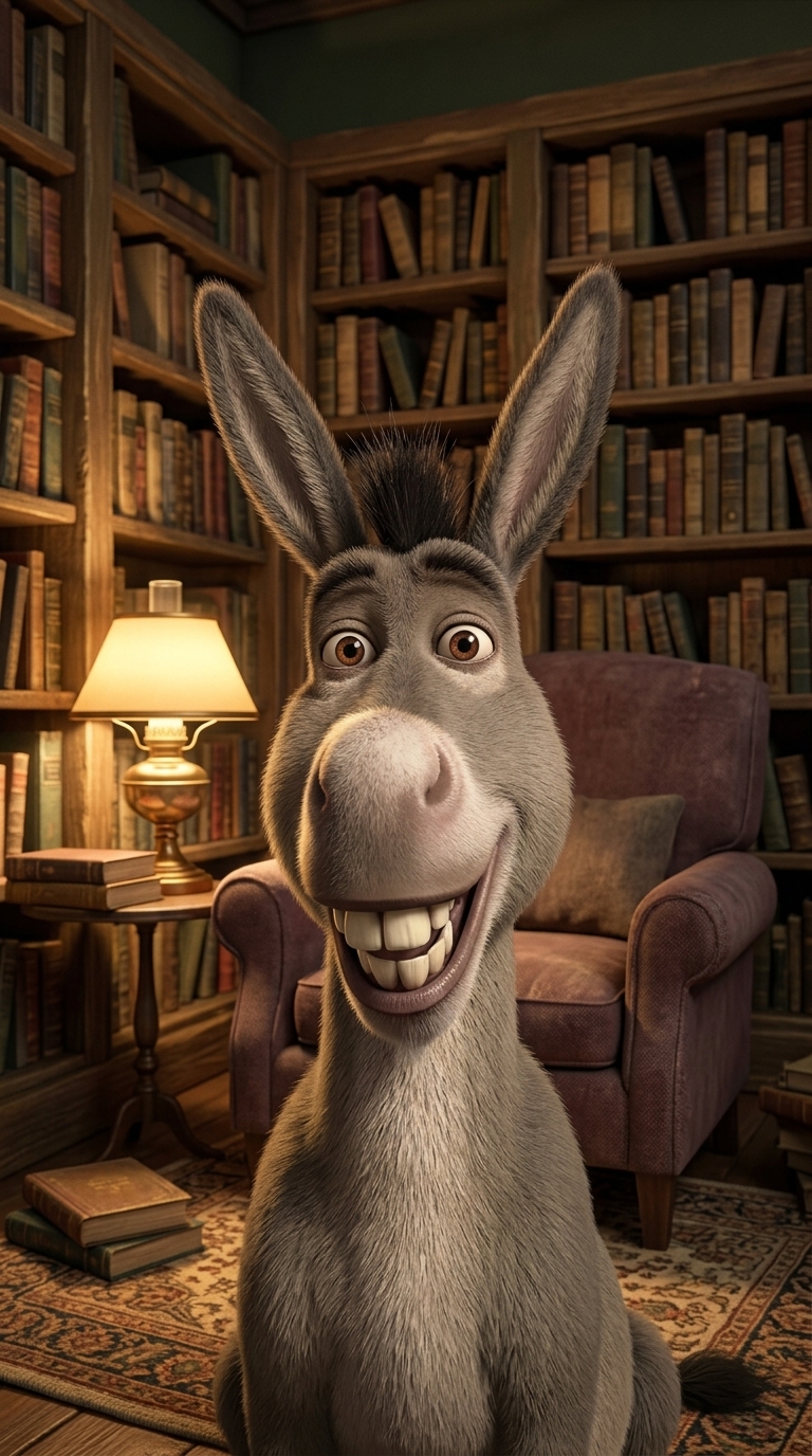 Уютный уголок библиотеки с высокими книжными полками и мягким креслом. Ослик сидит на ковре, глядя прямо в камеру с...
