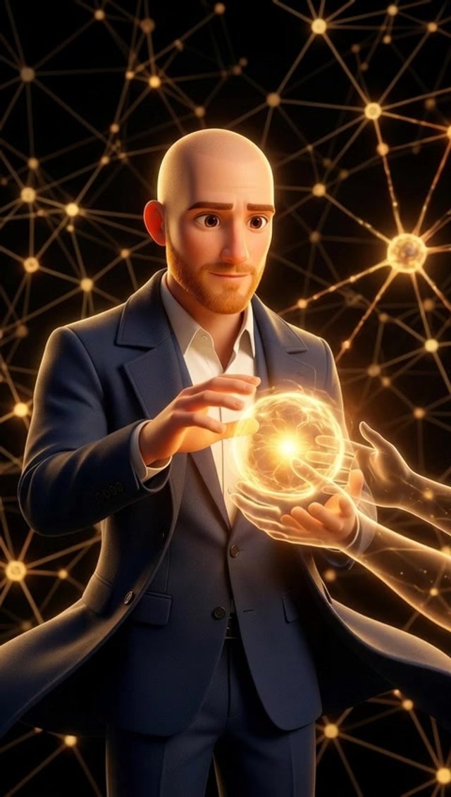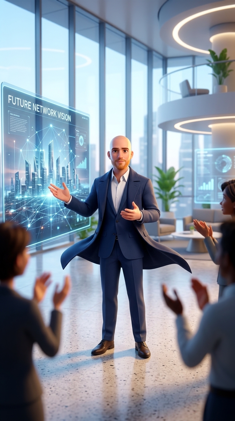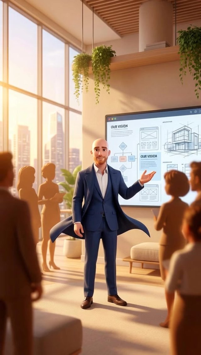 Strong rule: style --- 3D Pixar ---. Герман стоит в центре светлого современного коворкинга, окруженный размытыми силуэтами команды. Он ж...