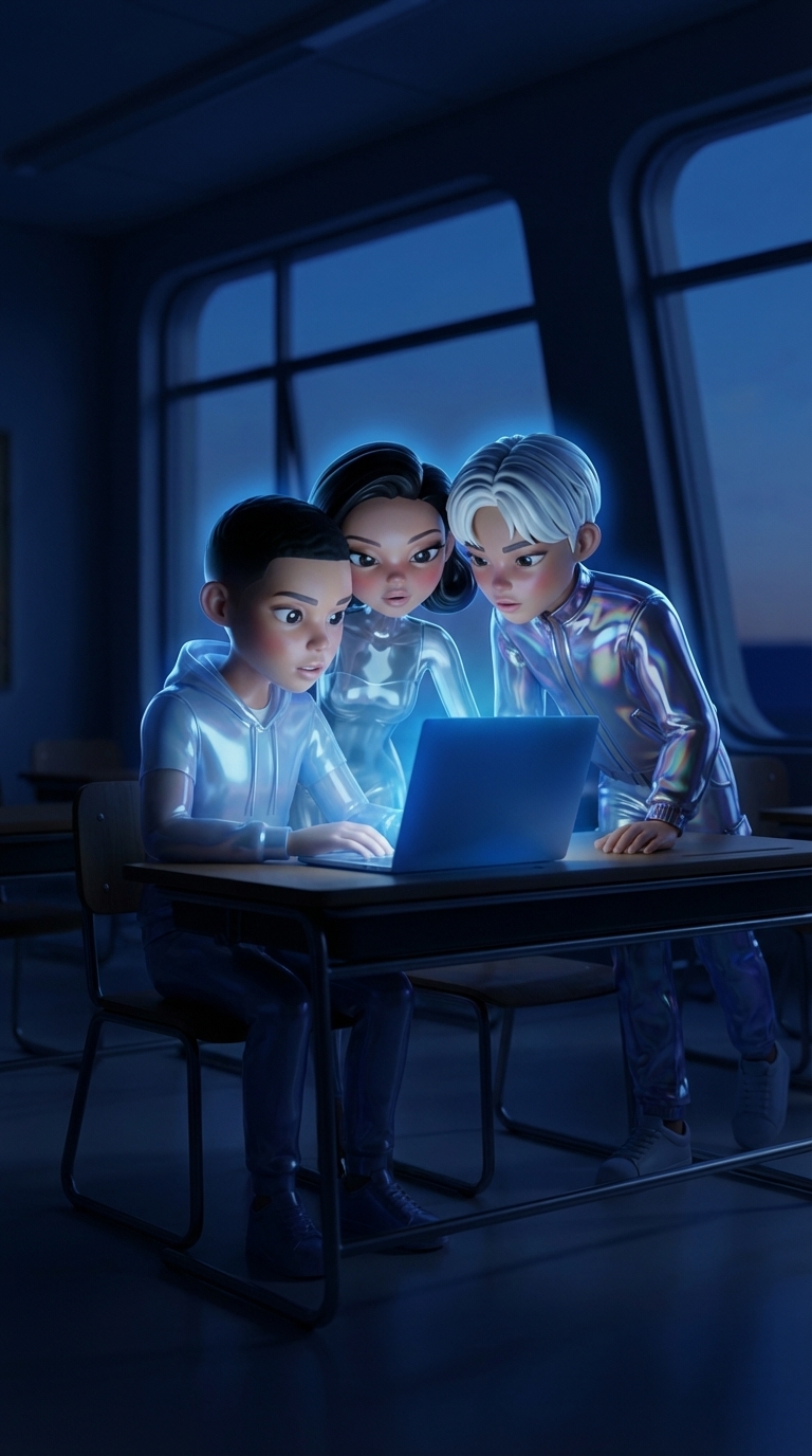 Strong rule: style --- Минимализм ---. Пустой школьный класс в сумерках. Самуэль, Марина и Кристиан сгрудились вокруг светящегося экрана ...