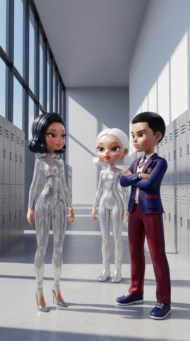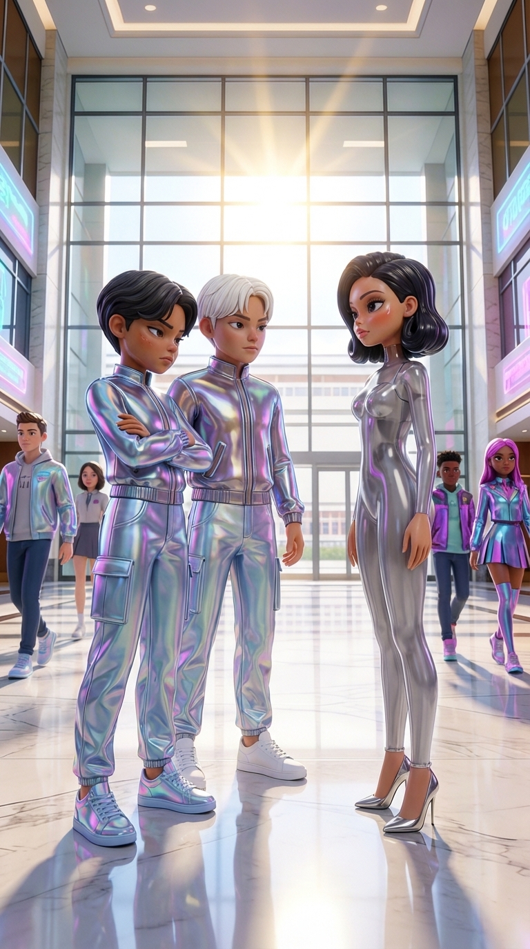 Strong rule: style --- Cyberpunk ---. Яркий коридор элитной школы. Гусман и Лу стоят плечом к плечу, преграждая путь Марине. Лу смотрит с...
