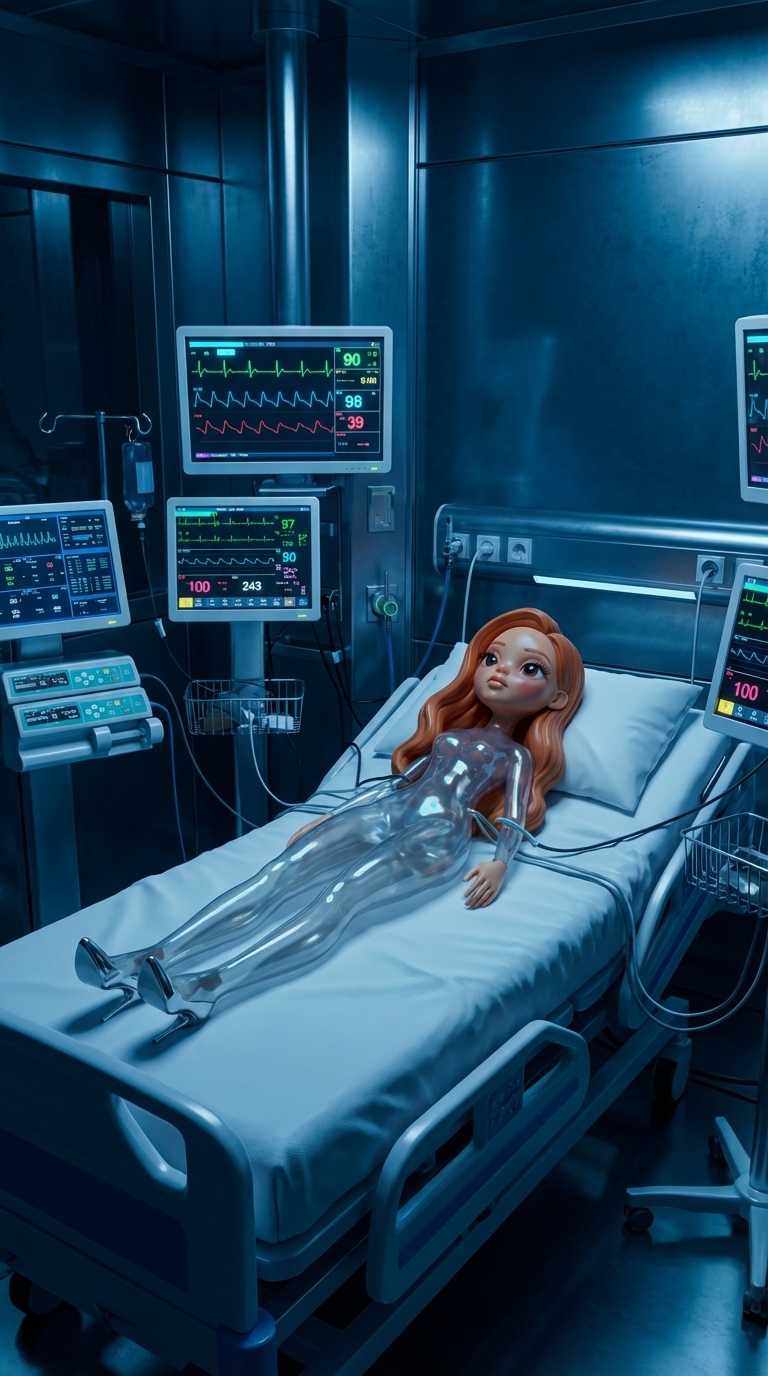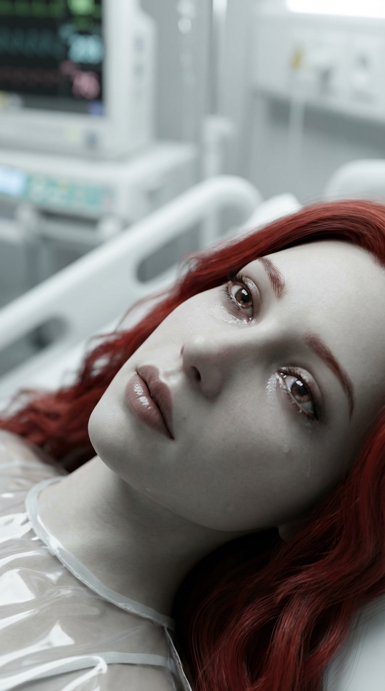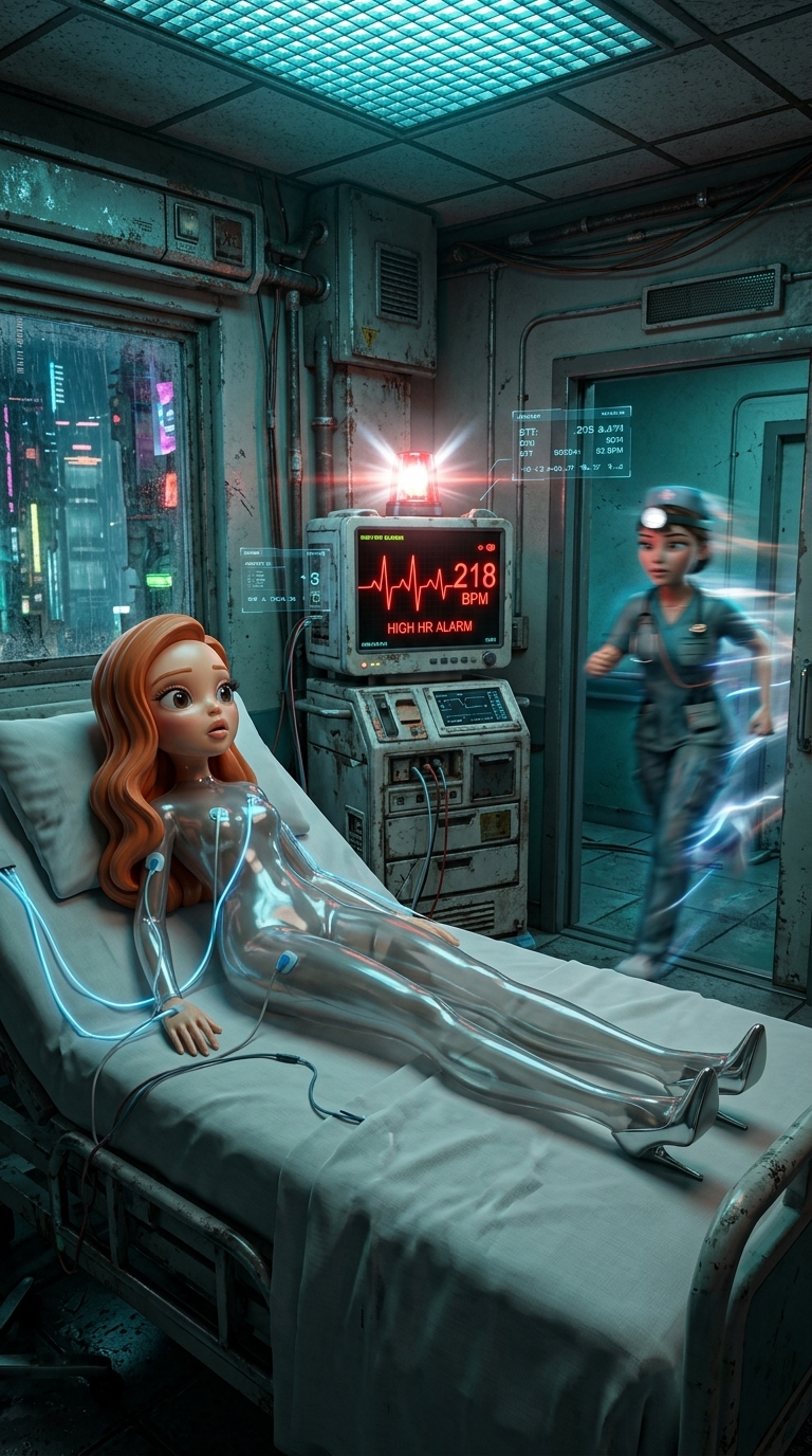 Strong rule: style --- Cyberpunk ---. Больничная палата. Монитор состояния пациента показывает резкий скачок пульса, издавая тревожный си...