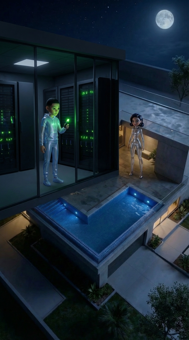 Strong rule: style --- Минимализм ---. Территория загородного особняка ночью. Самуэль находится внутри темной серверной, свет флешки мига...