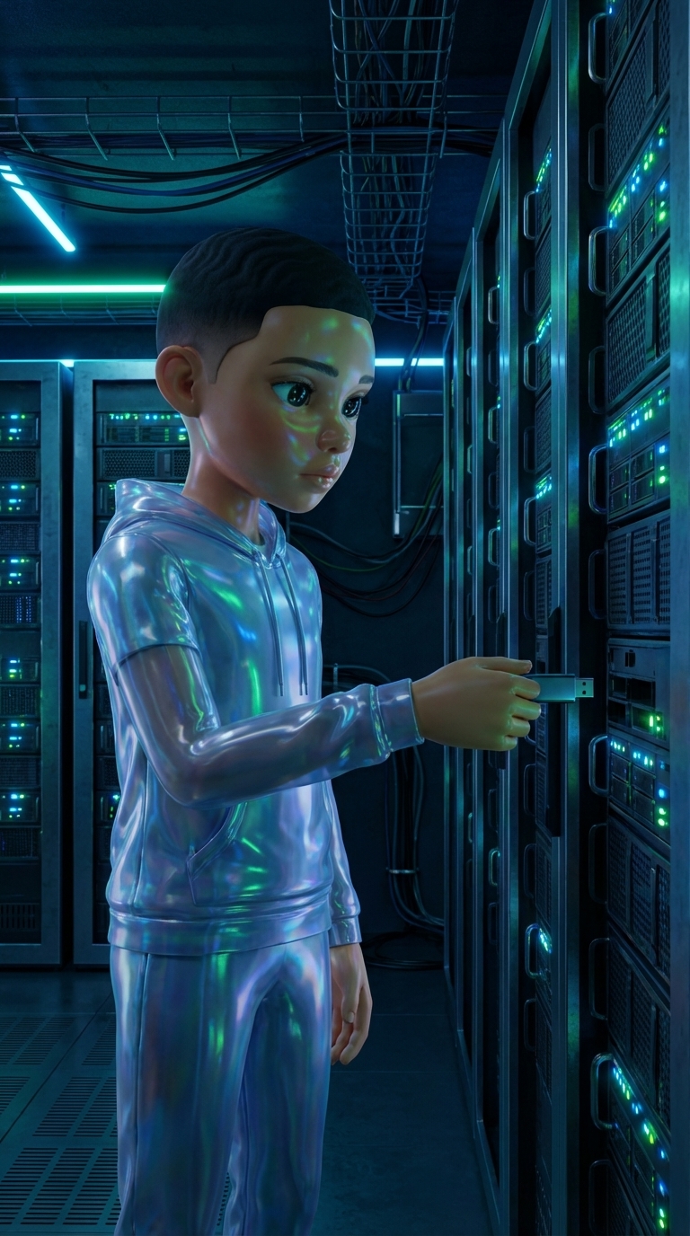 Strong rule: style --- Cyberpunk ---. Интерьер серверной комнаты с мигающими синими и зелеными огнями. Самуэль стоит перед стойкой, встав...