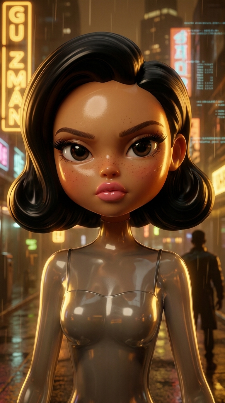 Strong rule: style --- Cyberpunk ---. Крупный план лица Марины. Ее глаза горят решимостью, губы плотно сжаты. Свет падает сбоку, подчерки...