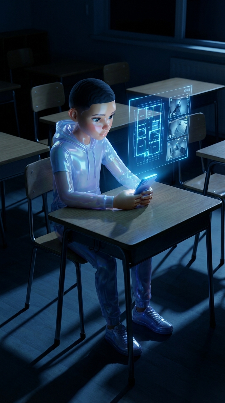 Strong rule: style --- Cyberpunk ---. Самуэль в пустом темном классе сидит за партой. Его лицо освещено только ярким экраном смартфона. Н...