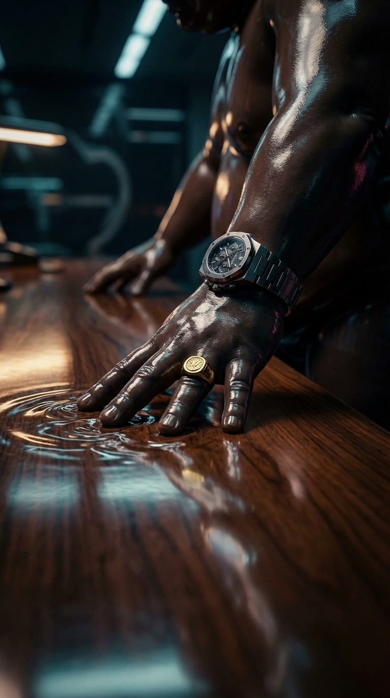 Strong rule: style --- Cyberpunk ---. Экстремально крупный план руки директора, резко опускающейся на полированную поверхность массивного...