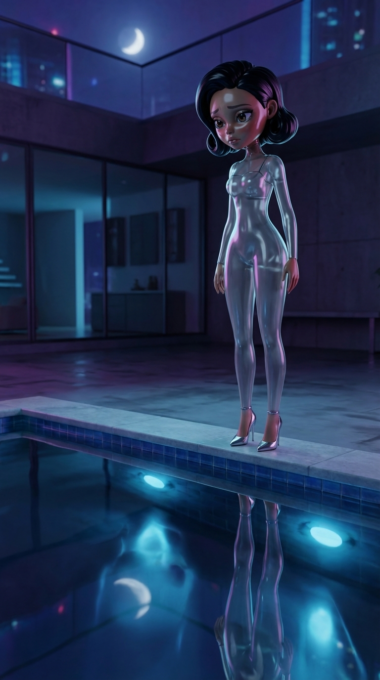 Strong rule: style --- Cyberpunk ---. Марина стоит на краю роскошного бассейна ночью. Вода неподвижна и отражает свет луны. Марина смотри...