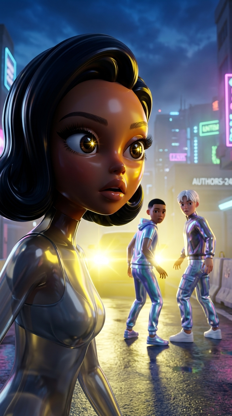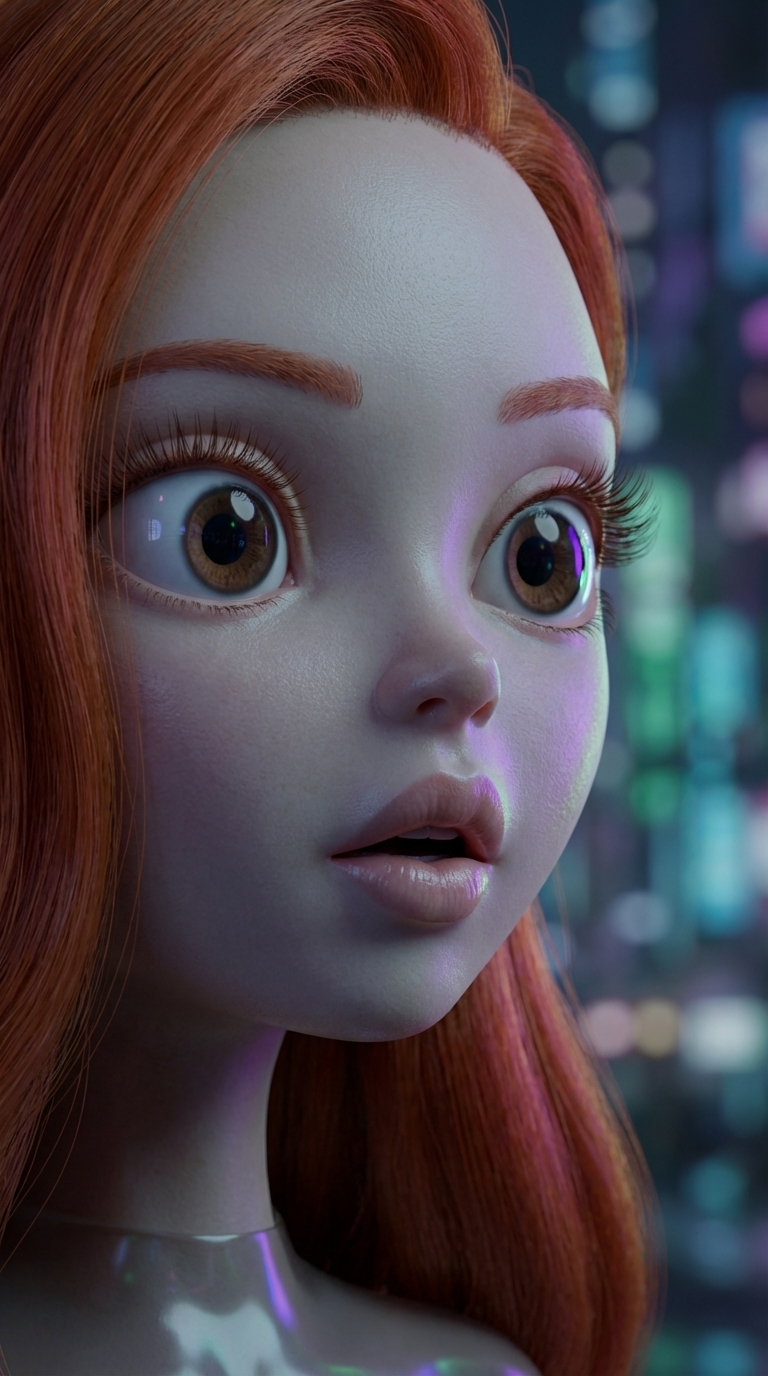Strong rule: style --- Cyberpunk ---. Крупный план лица Марины, она резко поворачивает голову на звук. В ее глазах отражается свет прибли...