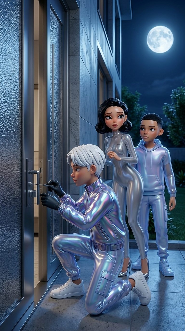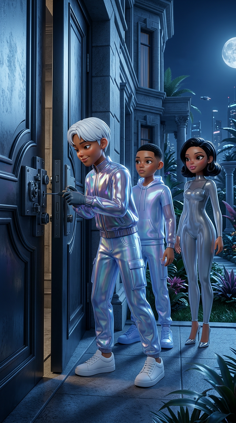 Strong rule: style --- Cyberpunk ---. Ночь. Трое друзей у массивной боковой двери роскошного особняка. Кристиан в перчатках держит отмычк...