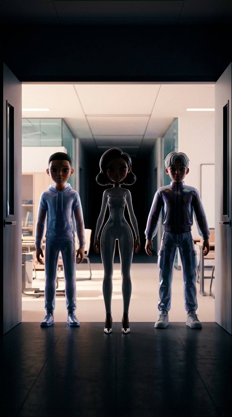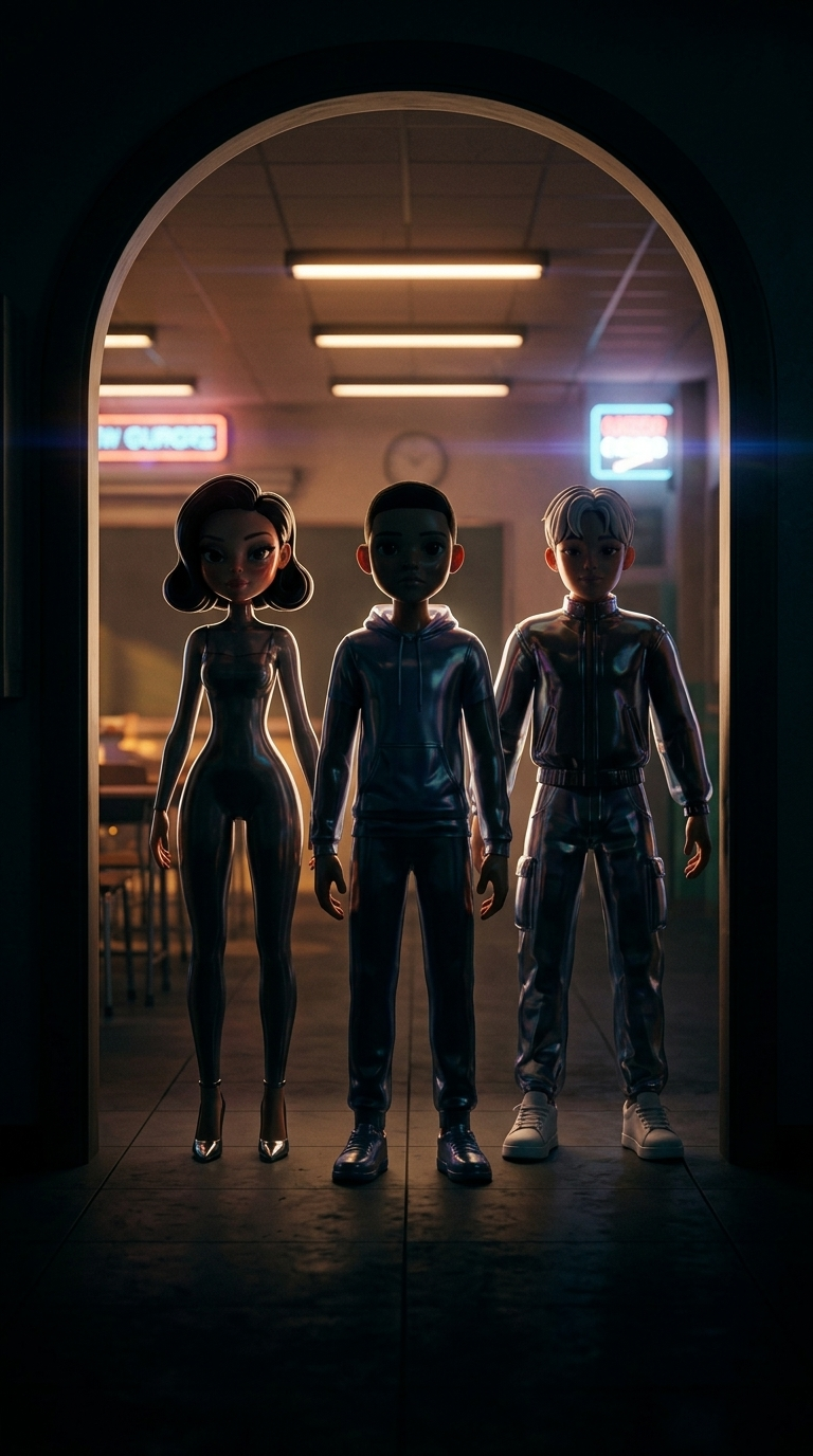 Strong rule: style --- Глянцевый кинематографичный ---. Общий план троих друзей, стоящих в дверях класса. Они смотрят в темный коридор. ...