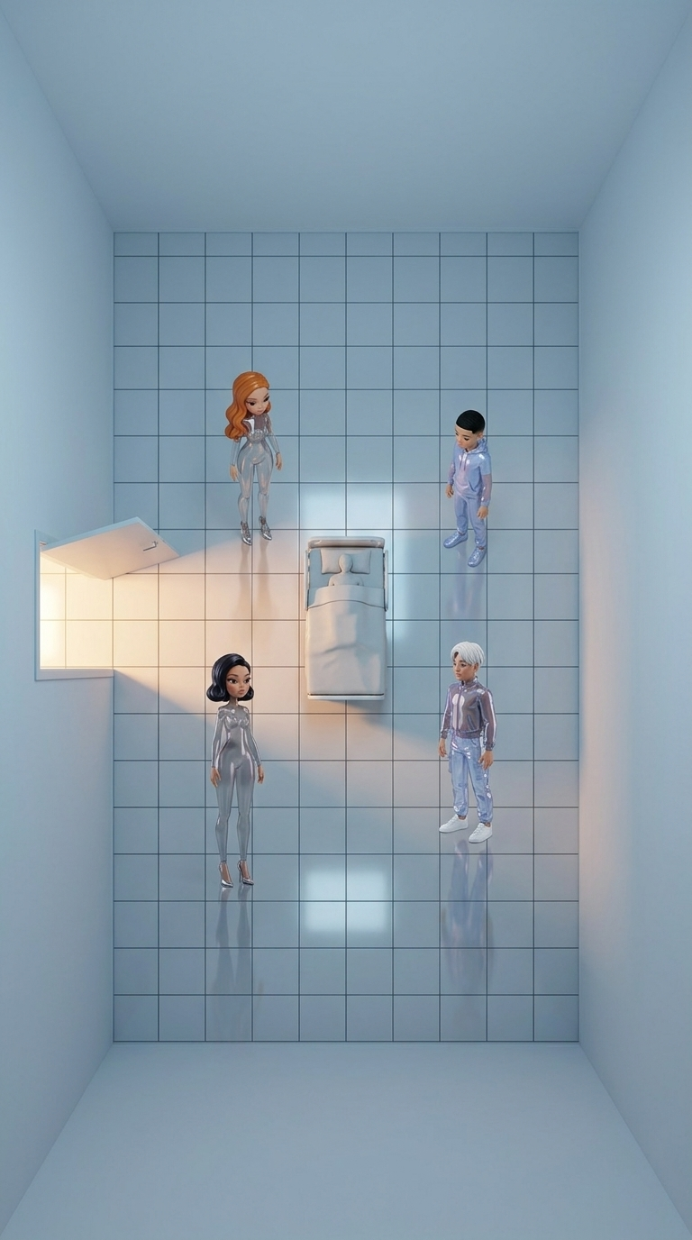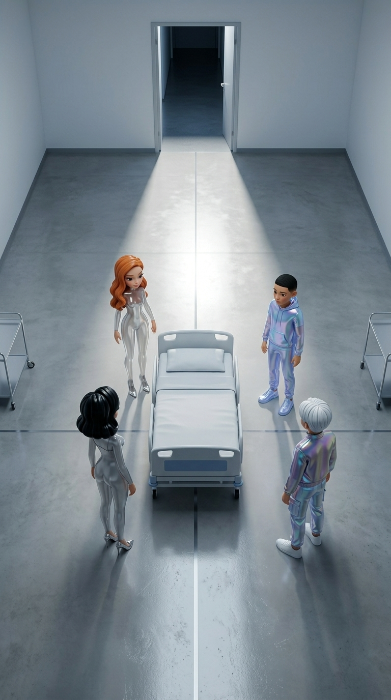 Strong rule: style --- Cyberpunk ---. Широкий план больничной палаты сверху вниз. Четыре фигуры образуют композицию вокруг кровати в цент...