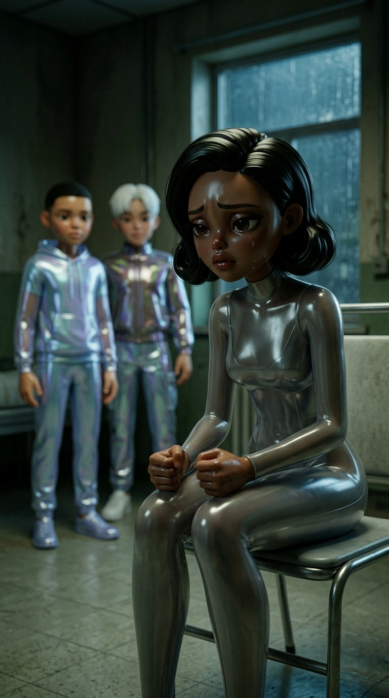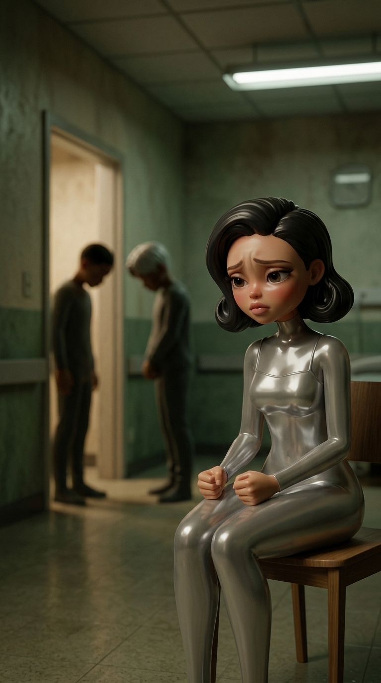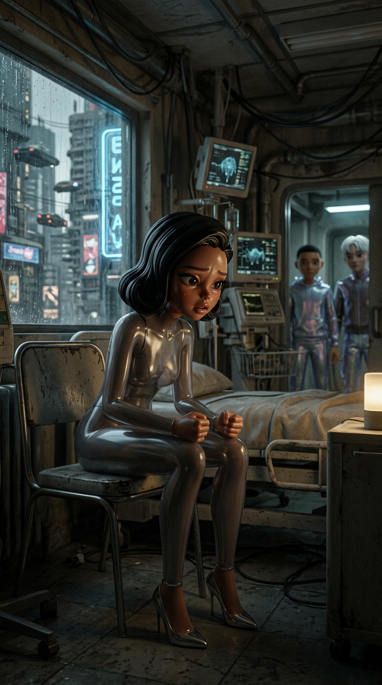 Strong rule: style --- Cyberpunk ---. Средний план Марины, сидящей на краю стула в больничной палате. Она сжимает руки, ее лицо выражает ...