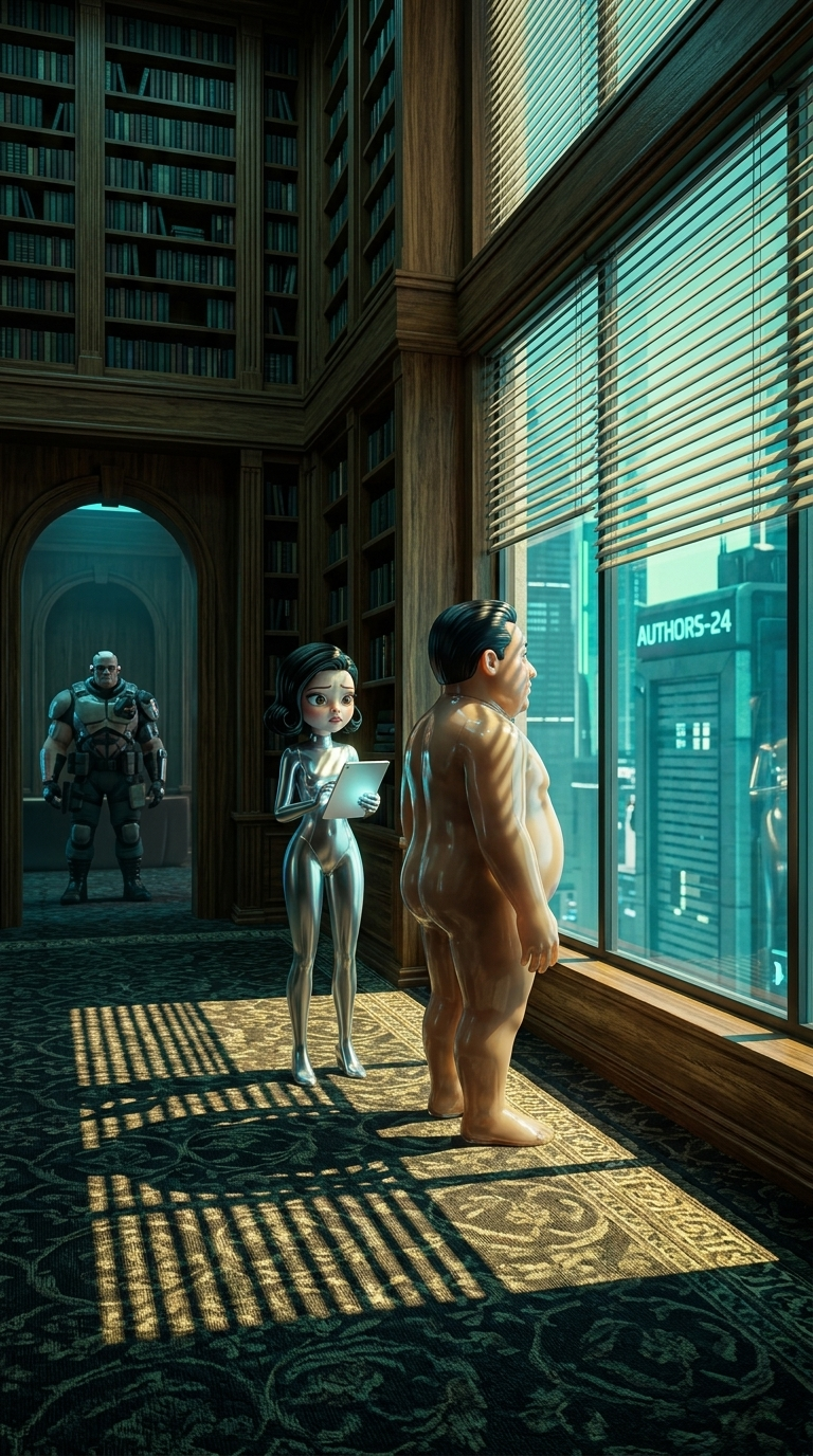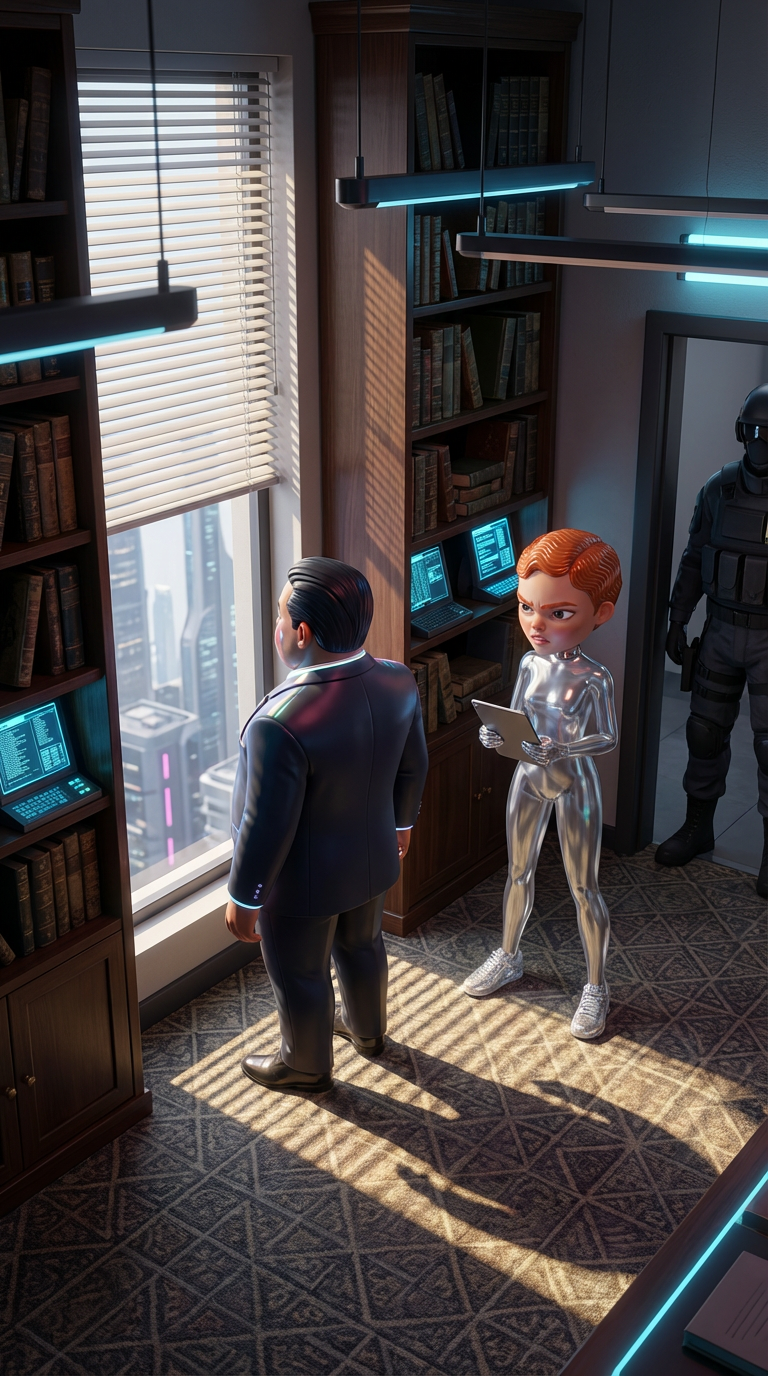 Strong rule: style --- Cyberpunk ---. Кабинет директора школы с высокими потолками и книжными шкафами. Директор стоит у окна спиной к кам...