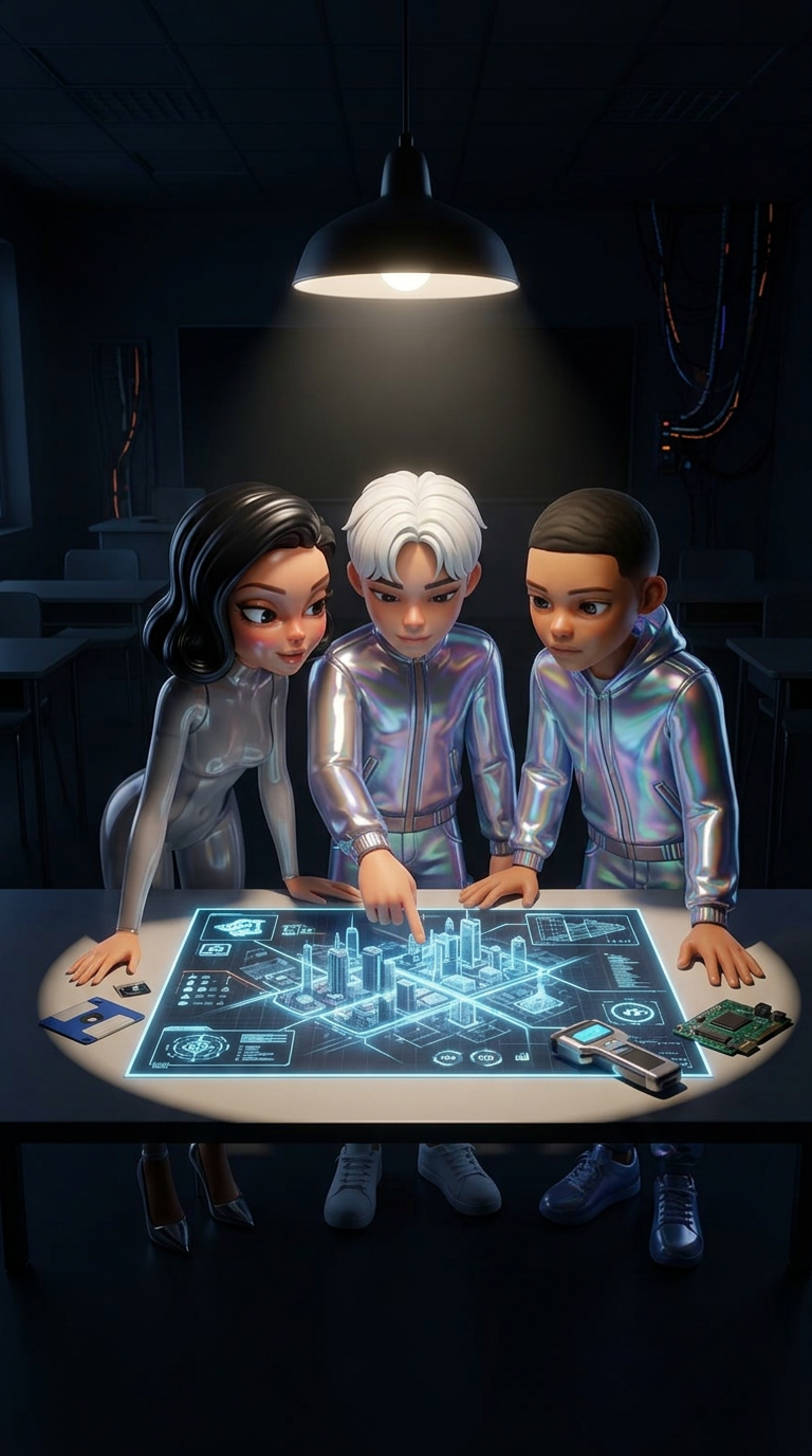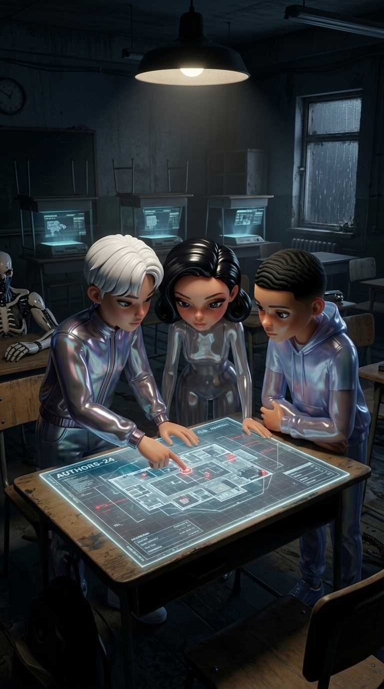 Strong rule: style --- Cyberpunk ---. Группа из трех друзей (Кристиан, Марина, Самуэль) склонилась над картой на столе в классе. Кристиан...